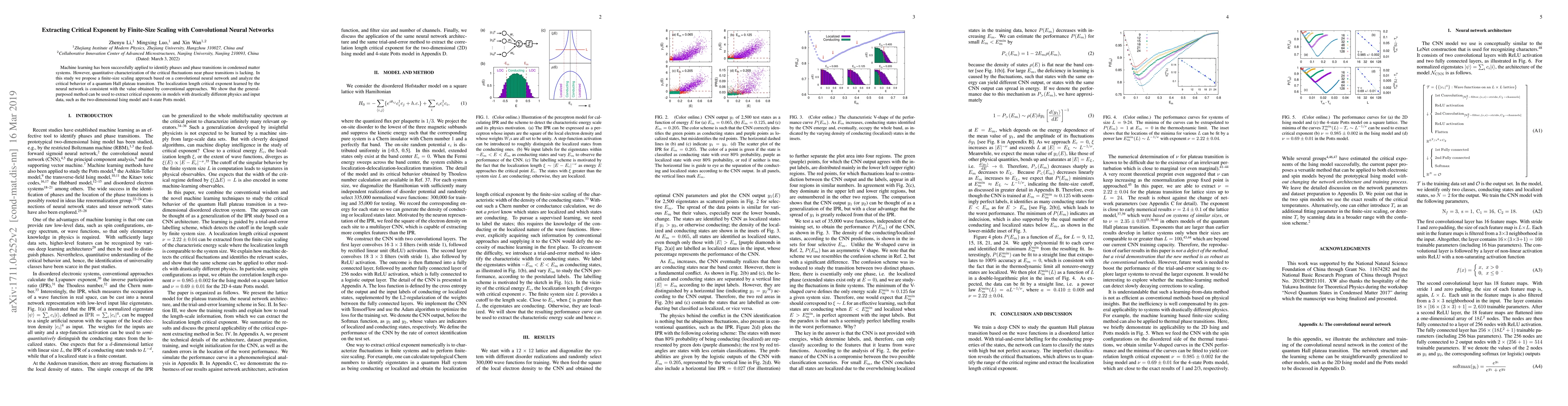 Machine learning has been successfully applied to identify phases and phase transitions in condensed matter systems. However, quantitative characterization of the critical fluctuations near phase transitions is lacking. In this study we propose a finite-size scaling approach based on a convolutional neural network and analyze the critical behavior of a quantum Hall plateau transition. The localization length critical exponent learned by the neural network is consistent with the value obtained by conventional approaches. We show that the general-purposed method can be used to extract critical exponents in models with drastically different physics and input data, such as the two-dimensional Ising model and 4-state Potts model.
