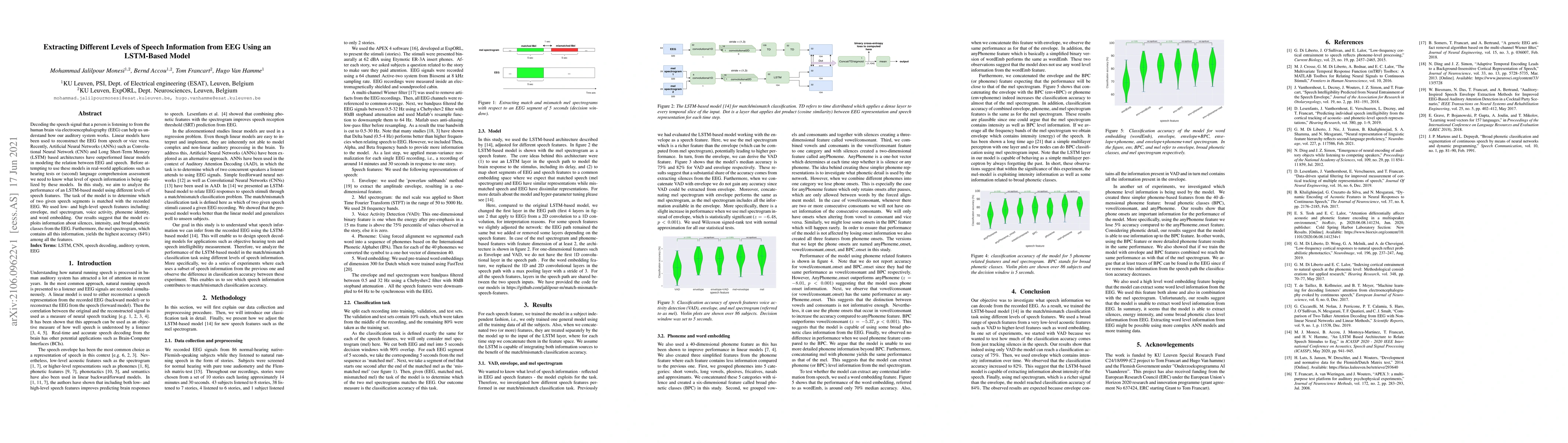 This study investigates the performance of an LSTM-based model in decoding EEG signals to determine which of two speech segments matches the EEG recording. The model utilizes various speech features, including envelope, mel spectrogram, voice activity, phoneme identity, and word embedding, achieving the highest accuracy of 84% with the mel spectrogram.