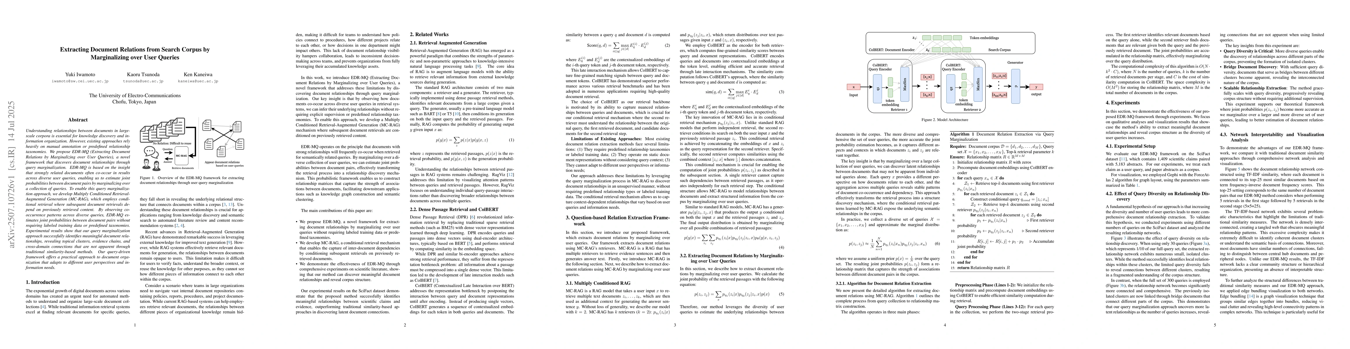 Understanding relationships between documents in large-scale corpora is essential for knowledge discovery and information organization. However, existing approaches rely heavily on manual annotation or predefined relationship taxonomies. We propose EDR-MQ (Extracting Document Relations by Marginalizing over User Queries), a novel framework that discovers document relationships through query marginalization. EDR-MQ is based on the insight that strongly related documents often co-occur in results across diverse user queries, enabling us to estimate joint probabilities between document pairs by marginalizing over a collection of queries. To enable this query marginalization approach, we develop Multiply Conditioned Retrieval-Augmented Generation (MC-RAG), which employs conditional retrieval where subsequent document retrievals depend on previously retrieved content. By observing co-occurrence patterns across diverse queries, EDR-MQ estimates joint probabilities between document pairs without requiring labeled training data or predefined taxonomies. Experimental results show that our query marginalization approach successfully identifies meaningful document relationships, revealing topical clusters, evidence chains, and cross-domain connections that are not apparent through traditional similarity-based methods. Our query-driven framework offers a practical approach to document organization that adapts to different user perspectives and information needs.