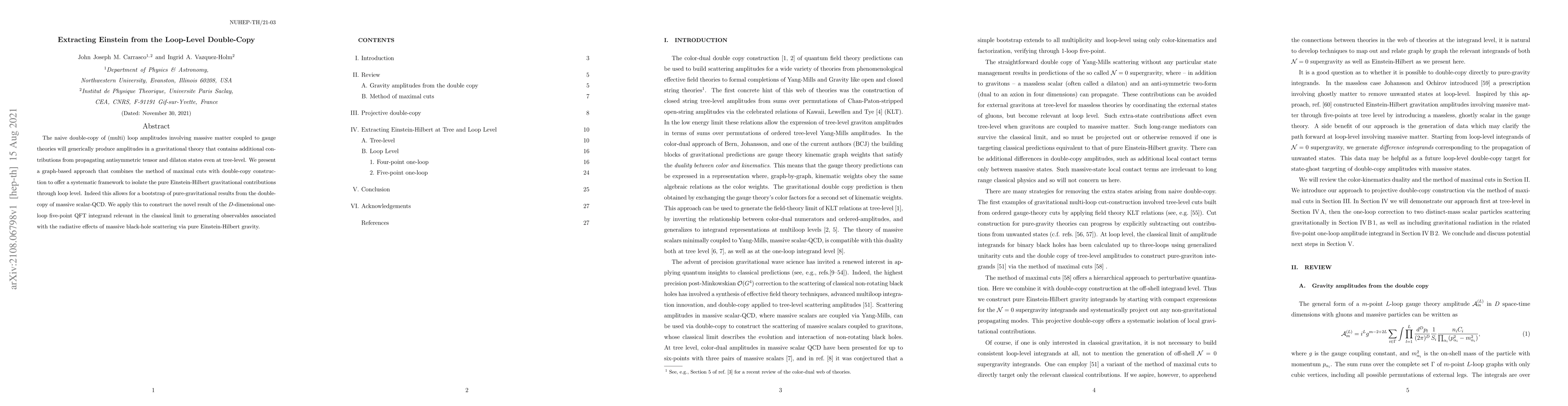 The naive double-copy of (multi) loop amplitudes involving massive matter coupled to gauge theories will generically produce amplitudes in a gravitational theory that contains additional contributions from propagating antisymmetric tensor and dilaton states even at tree-level. We present a graph-based approach that combines the method of maximal cuts with double-copy construction to offer a systematic framework to isolate the pure Einstein-Hilbert gravitational contributions through loop level. Indeed this allows for a bootstrap of pure-gravitational results from the double-copy of massive scalar-QCD. We apply this to construct the novel result of the D-dimensional one-loop five-point QFT integrand relevant in the classical limit to generating observables associated with the radiative effects of massive black-hole scattering via pure Einstein-Hilbert gravity.
