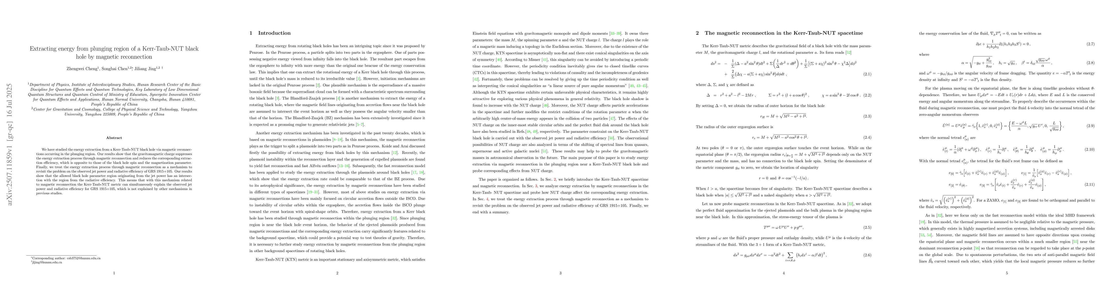 We have studied the energy extraction from a Kerr-Taub-NUT black hole via magnetic reconnections occurring in the plunging region. Our results show that the gravitomagnetic charge suppresses the energy extraction process through magnetic reconnection and reduces the corresponding extraction efficiency, which is opposite to those of the black hole spin and the magnetization parameter. Finally, we treat the energy extraction process through magnetic reconnection as a mechanism to revisit the problem on the observed jet power and radiative efficiency of GRS 1915+105. Our results show that the allowed black hole parameter region originating from the jet power has an intersection with the region from the radiative efficiency. This means that with this mechanism related to magnetic reconnection the Kerr-Taub-NUT metric can simultaneously explain the observed jet power and radiative efficiency for GRS 1915+105, which is not explained by other mechanisms in previous studies.