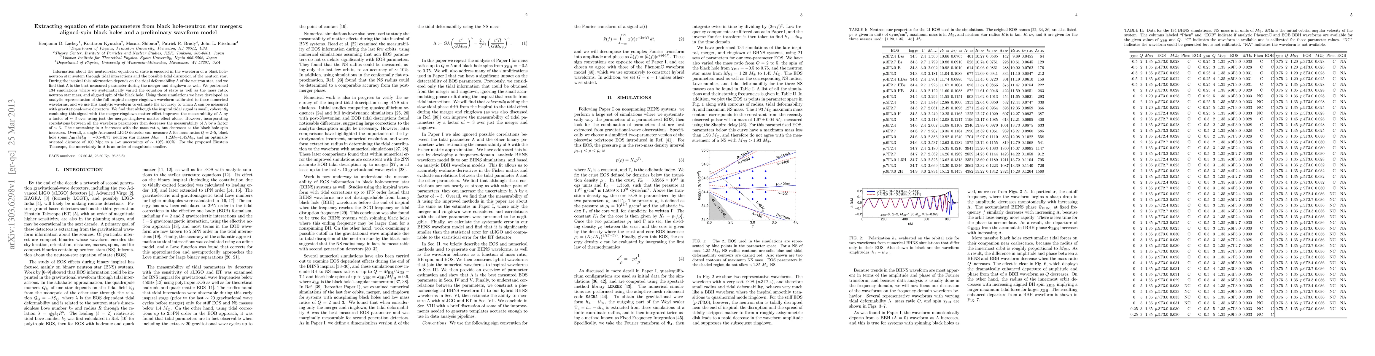 Information about the neutron-star equation of state is encoded in the waveform of a black hole-neutron star system through tidal interactions and the possible tidal disruption of the neutron star. During the inspiral this information depends on the tidal deformability Lambda of the neutron star, and we find that Lambda is the best measured parameter during the merger and ringdown as well. We performed 134 simulations where we systematically varied the equation of state as well as the mass ratio, neutron star mass, and aligned spin of the black hole. Using these simulations we have developed an analytic representation of the full inspiral-merger-ringdown waveform calibrated to these numerical waveforms, and we use this analytic waveform to estimate the accuracy to which Lambda can be measured with gravitational-wave detectors. We find that although the inspiral tidal signal is small, coherently combining this signal with the merger-ringdown matter effect improves the measurability of Lambda by a factor of ~3 over using just the merger-ringdown matter effect alone. However, incorporating correlations between all the waveform parameters then decreases the measurability of Lambda by a factor of ~3. The uncertainty in Lambda increases with the mass ratio, but decreases as the black hole spin increases. Overall, a single Advanced LIGO detector can measure Lambda for mass ratios Q = 2--5, black hole spins J_BH/M_BH^2 = -0.5--0.75, neutron star masses M_NS = 1.2M_sun--1.45M_sun, and an optimally oriented distance of 100Mpc to an uncertainty of ~10%--100%. For the proposed Einstein Telescope, the uncertainty in Lambda is an order of magnitude smaller.