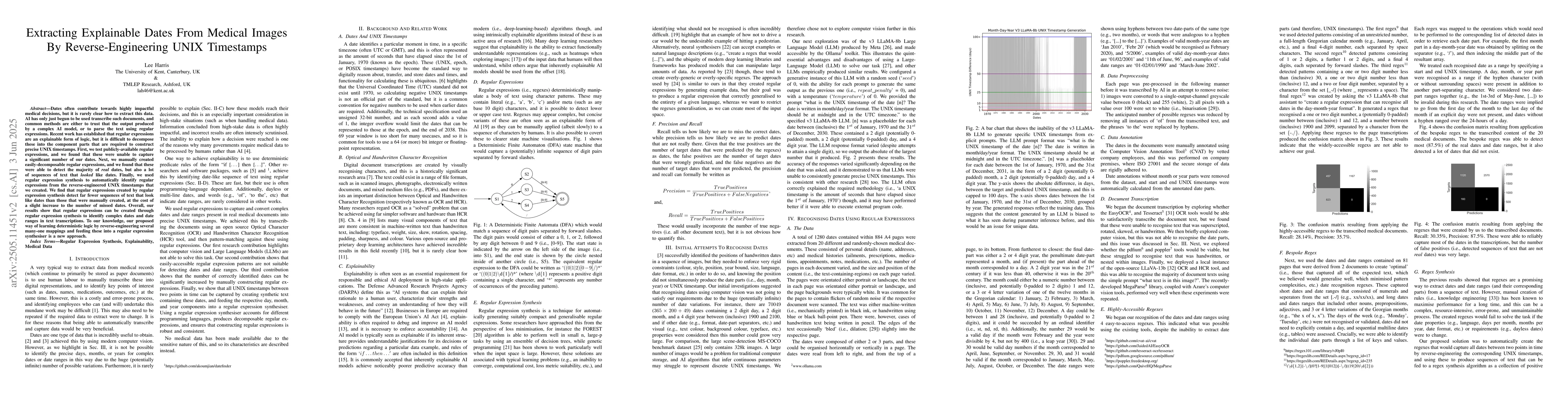 Dates often contribute towards highly impactful medical decisions, but it is rarely clear how to extract this data. AI has only just begun to be used transcribe such documents, and common methods are either to trust that the output produced by a complex AI model, or to parse the text using regular expressions. Recent work has established that regular expressions are an explainable form of logic, but it is difficult to decompose these into the component parts that are required to construct precise UNIX timestamps. First, we test publicly-available regular expressions, and we found that these were unable to capture a significant number of our dates. Next, we manually created easily-decomposable regular expressions, and we found that these were able to detect the majority of real dates, but also a lot of sequences of text that look like dates. Finally, we used regular expression synthesis to automatically identify regular expressions from the reverse-engineered UNIX timestamps that we created. We find that regular expressions created by regular expression synthesis detect far fewer sequences of text that look like dates than those that were manually created, at the cost of a slight increase to the number of missed dates. Overall, our results show that regular expressions can be created through regular expression synthesis to identify complex dates and date ranges in text transcriptions. To our knowledge, our proposed way of learning deterministic logic by reverse-engineering several many-one mappings and feeding these into a regular expression synthesiser is a new approach.