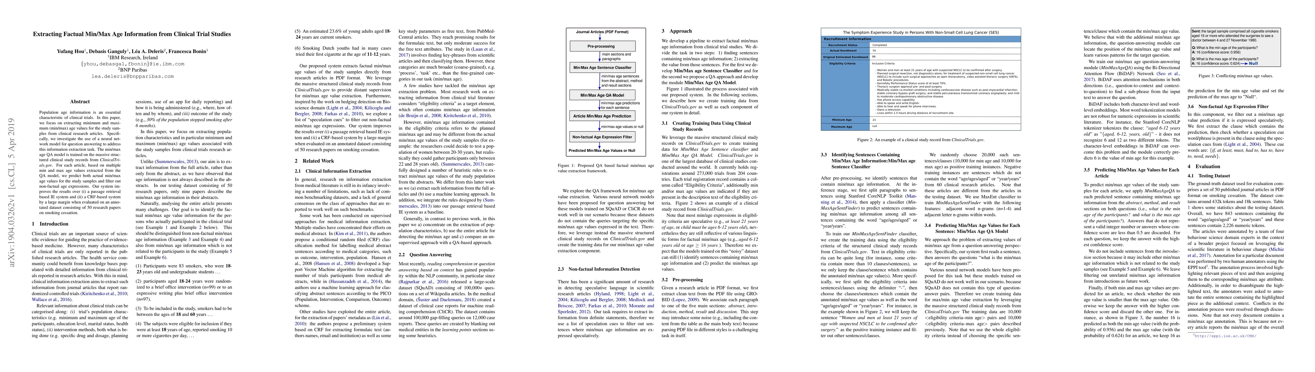 Population age information is an essential characteristic of clinical trials. In this paper, we focus on extracting minimum and maximum (min/max) age values for the study samples from clinical research articles. Specifically, we investigate the use of a neural network model for question answering to address this information extraction task. The min/max age QA model is trained on the massive structured clinical study records from ClinicalTrials.gov. For each article, based on multiple min and max age values extracted from the QA model, we predict both actual min/max age values for the study samples and filter out non-factual age expressions. Our system improves the results over (i) a passage retrieval based IE system and (ii) a CRF-based system by a large margin when evaluated on an annotated dataset consisting of 50 research papers on smoking cessation.