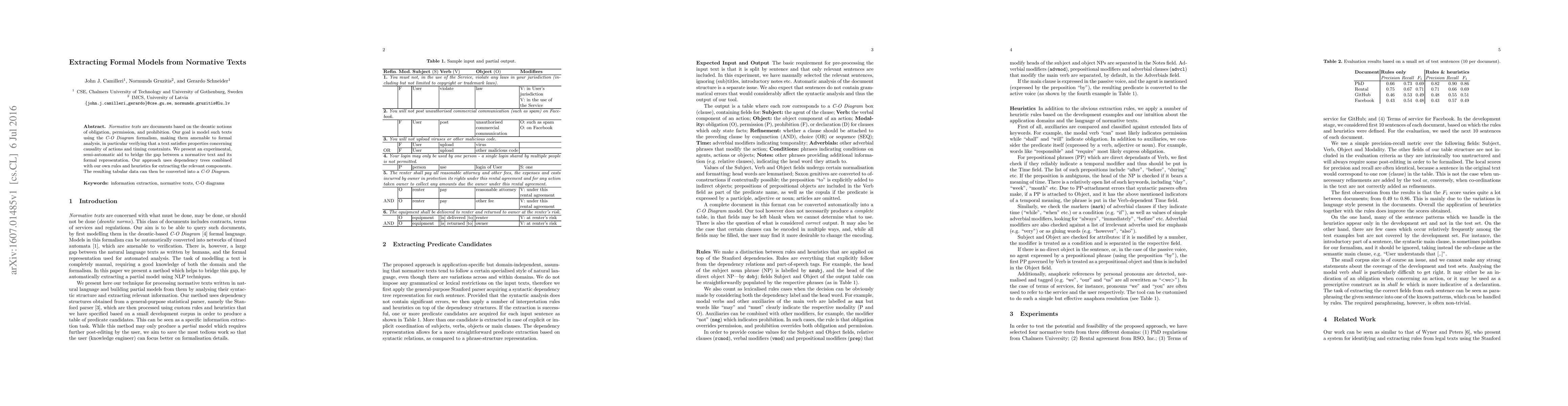 This paper presents a semi-automatic method to extract formal models from normative texts using C-O Diagrams, focusing on verifying causality and timing constraints. It employs dependency trees and custom rules to convert textual data into formal representations.