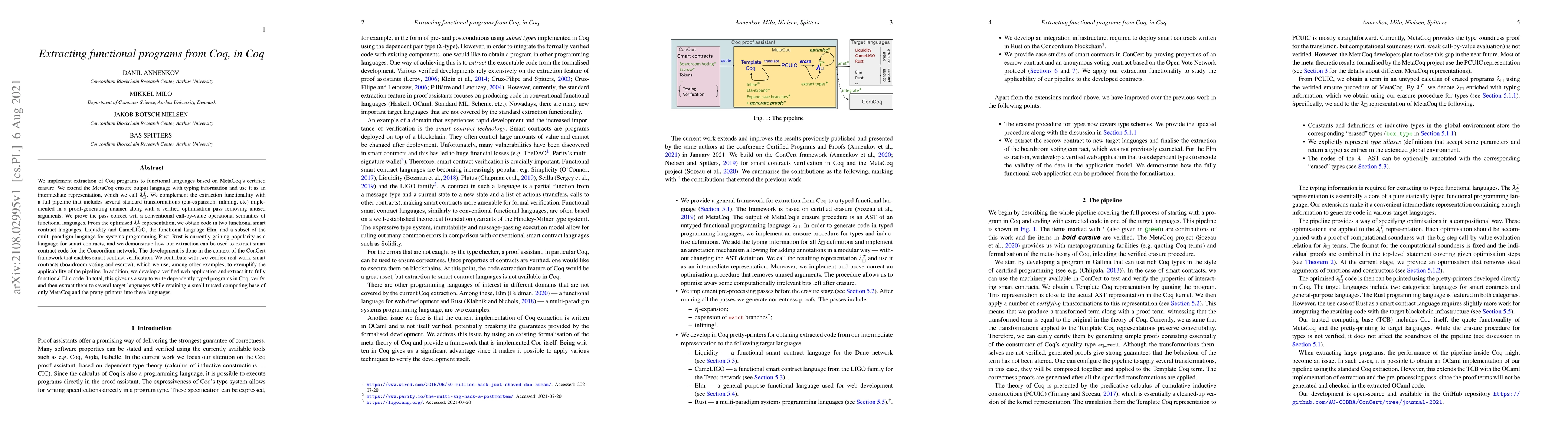This paper presents an implementation for extracting functional programs from Coq to various languages, including smart contract languages and Rust, using a certified erasure method. The authors introduce an intermediate representation, $\lambda^T_\square$, and a proof-generating pipeline for optimizations, demonstrating the extraction with real-world smart contracts and a verified web application.