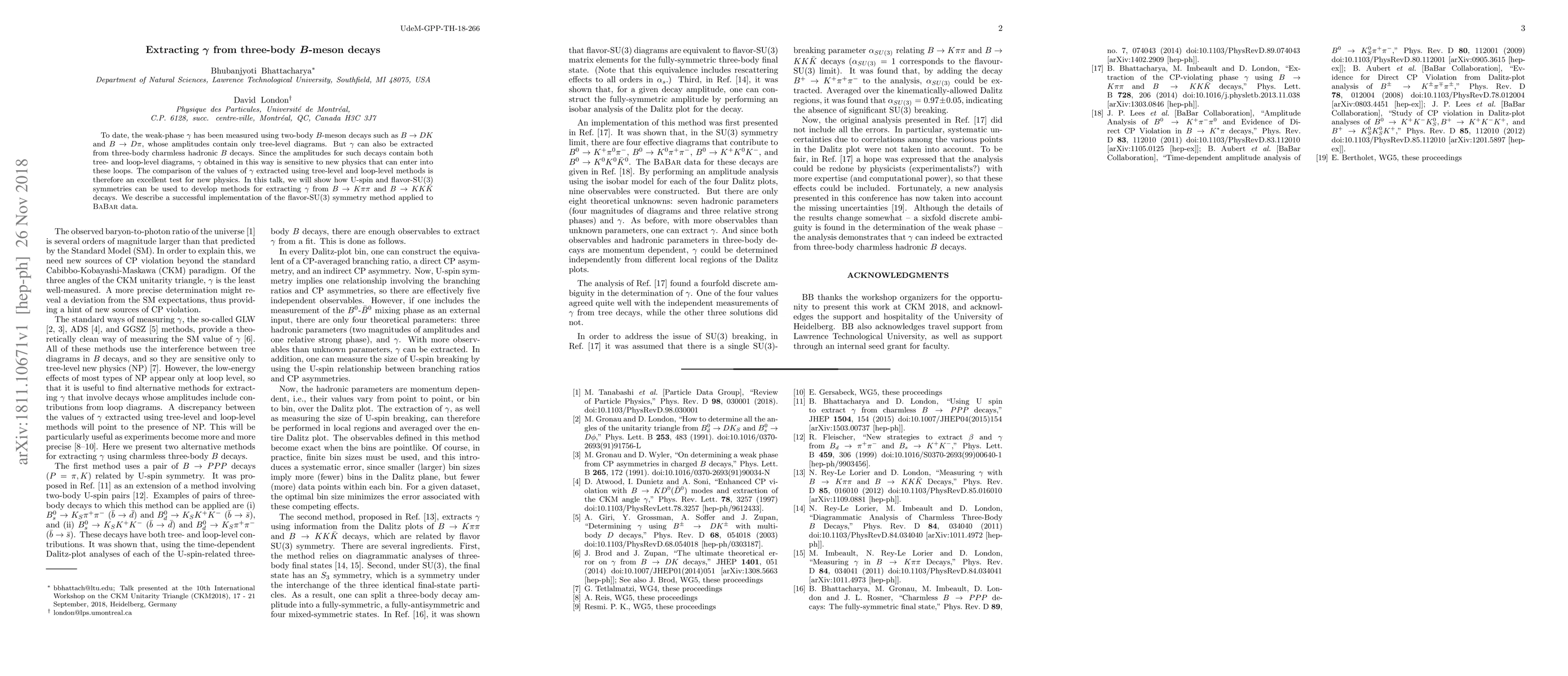 This paper explores extracting the weak-phase $\gamma$ from three-body $B$-meson decays, which include both tree- and loop-level diagrams, providing a test for new physics. The authors utilize U-spin and flavor-SU(3) symmetries to develop methods for $\gamma$ extraction from decays like $B\to K\pi\pi$ and $B\to KK{\bar K}$, and demonstrate the effectiveness of the flavor-SU(3) method using BaBar data.
