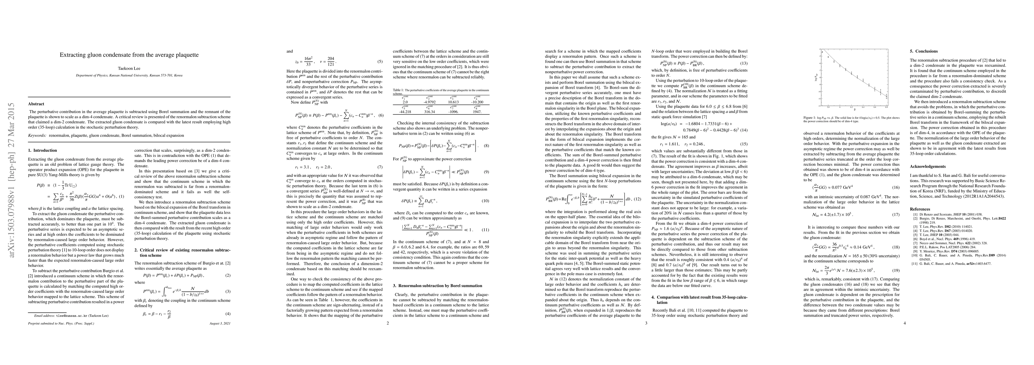 The perturbative contribution in the average plaquette is subtracted using Borel summation and the remnant of the plaquette is shown to scale as a dim-4 condensate. A critical review is presented of the renormalon subtraction scheme that claimed a dim-2 condensate. The extracted gluon condensate is compared with the latest result employing high order (35-loop) calculation in the stochastic perturbation theory.