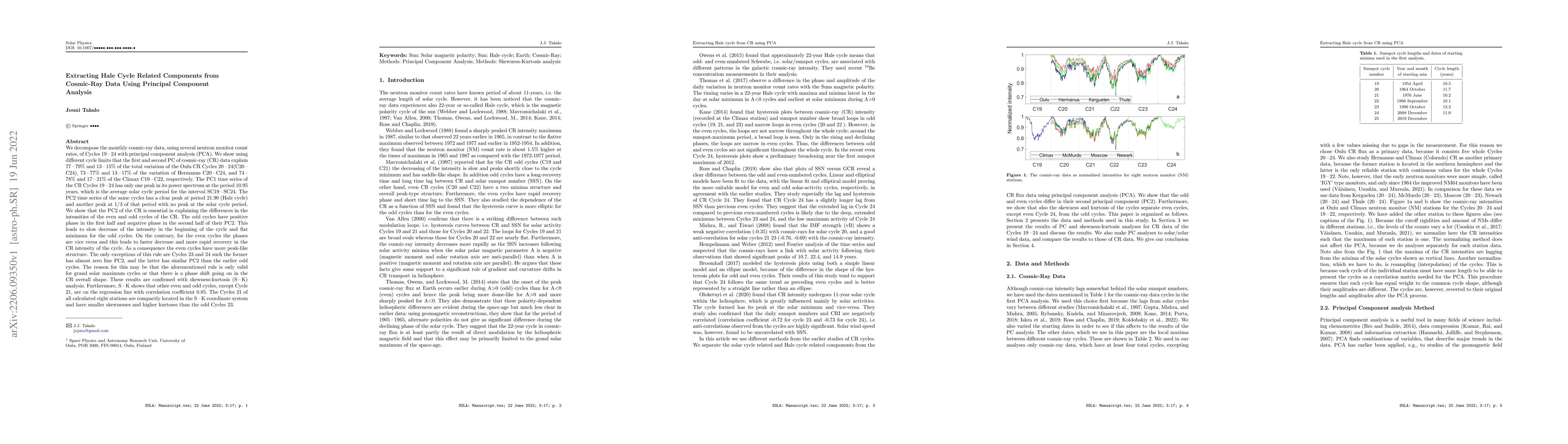 We decompose the monthly cosmic-ray data, using several neutron monitor count rates, of Cycles 19-24 with principal component analysis (PCA). We show using different cycle limits that the first and second PC of cosmic-ray (CR) data explain 77-79% and 13-15% of the total variation of the Oulu CR Cycles 20-24 (C20- C24), 73-77% and 13-17% of the variation of Hermanus C20-C24, and 74-78% and 17-21% of the Climax C19-C22, respectively. The PC1 time series of the CR Cycles 19-24 has only one peak in its power spectrum at the period 10.95 years, which is the average solar cycle period for the interval SC19-SC24. The PC2 time series of the same cycles has a clear peak at period 21.90 (Hale cycle) and another peak at 1/3 of that period with no peak at the solar cycle period. We show that the PC2 of the CR is essential in explaining the differences in the intensities of the even and odd cycles of the CR. The odd cycles have positive phase in the first half and negative phase in the second half of their PC2. This leads to slow decrease of the intensity in the beginning of the cycle and at minimum for the odd cycles. On the contrary, for the even cycles the phases are vice versa and this leads to faster decrease and more rapid recovery in the CR intensity of the cycle. As a consequence the even cycles have more peak-like structure. The only exceptions of this rule are Cycles 23 and 24 such the former has almost zero line PC2, and the latter has similar PC2 than the earlier odd cycles. These results are confirmed with skewness-kurtosis (S-K) analysis. Furthermore, S-K shows that other even and odd cycles, except Cycle 21, are on the regression line with correlation coefficient 0.85. The Cycles 21 of all calculated eight stations are compactly located in the S -K coordinate system and have smaller skewnesses and higher kurtoses than the odd Cycles 23.