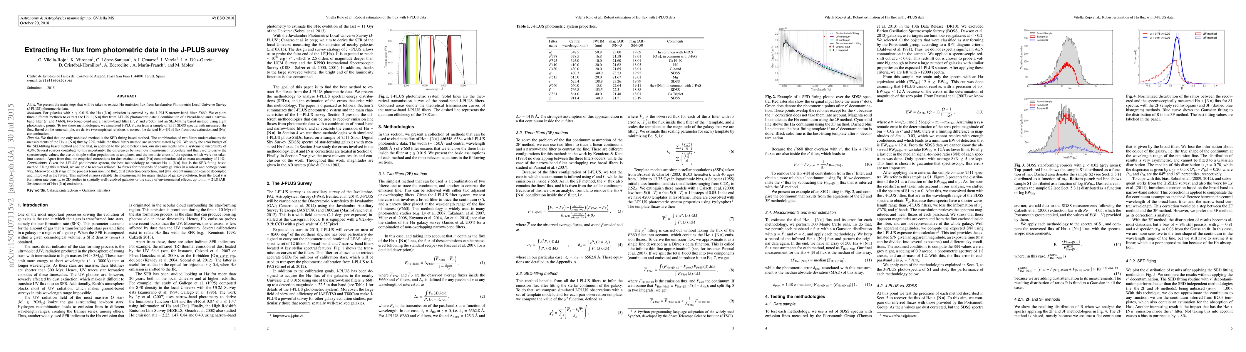 This paper outlines methods for extracting H$\alpha$ emission flux from J-PLUS survey photometric data, finding that SED-fitting based on 8 photometric points is the most unbiased method, despite systematic uncertainties and empirical corrections contributing to a total uncertainty of 18.3%.