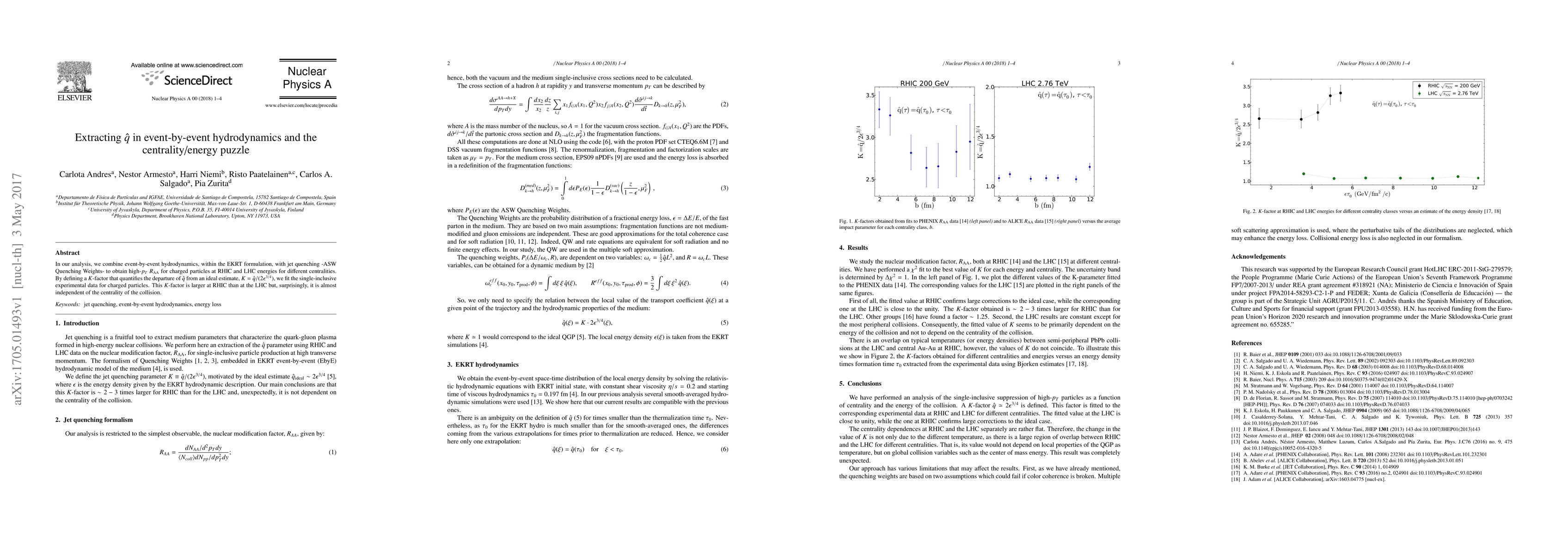 In our analysis, we combine event-by-event hydrodynamics, within the EKRT formulation, with jet quenching -ASW Quenching Weights- to obtain high-$p_T$ $R_{\rm AA}$ for charged particles at RHIC and LHC energies for different centralities. By defining a $K$-factor that quantifies the departure of $\hat{q}$ from an ideal estimate, $K = \hat{q}/(2\epsilon^{3/4})$, we fit the single-inclusive experimental data for charged particles. This $K$-factor is larger at RHIC than at the LHC but, surprisingly, it is almost independent of the centrality of the collision.