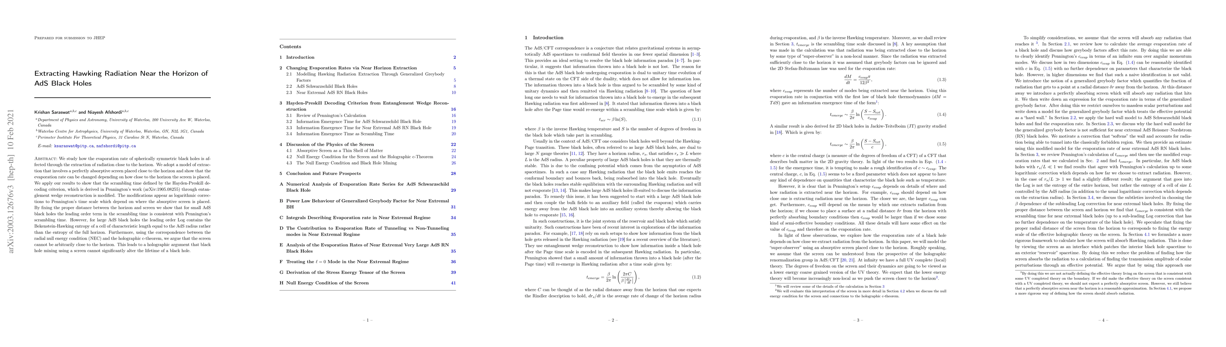The paper presents a novel model for analyzing the extraction of Hawking radiation near the horizon of AdS black holes, providing a framework to study the impact on evaporation rates and scrambling times.