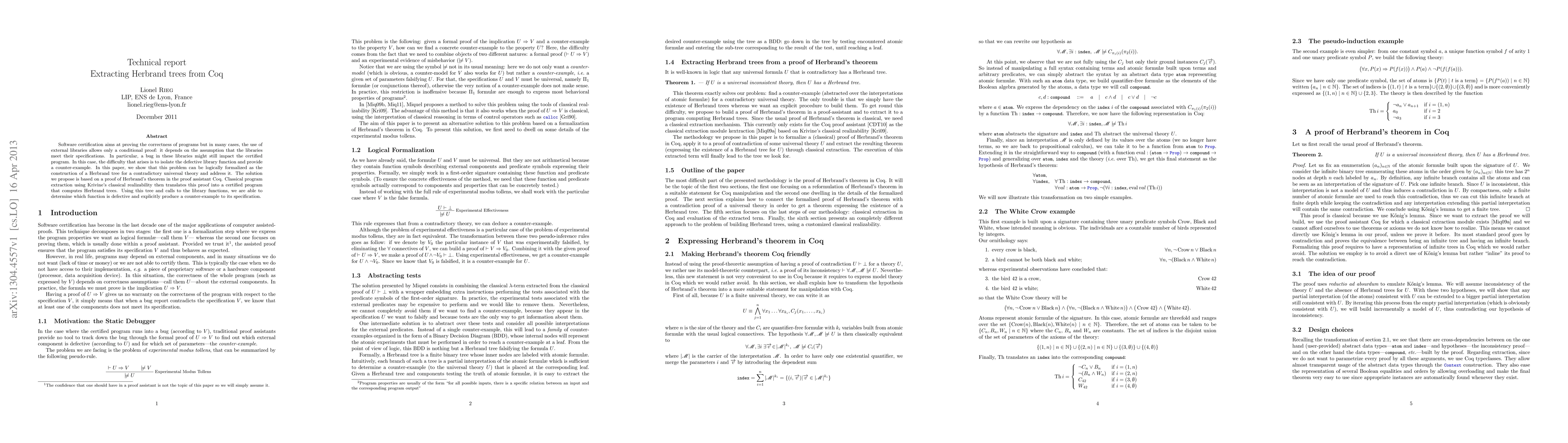 This paper presents a method for extracting Herbrand trees from Coq to isolate defective library functions and produce counter-examples, addressing the challenge of conditional proofs in software certification. The solution leverages Herbrand's theorem and Krivine's classical realizability to translate proofs into certified programs.