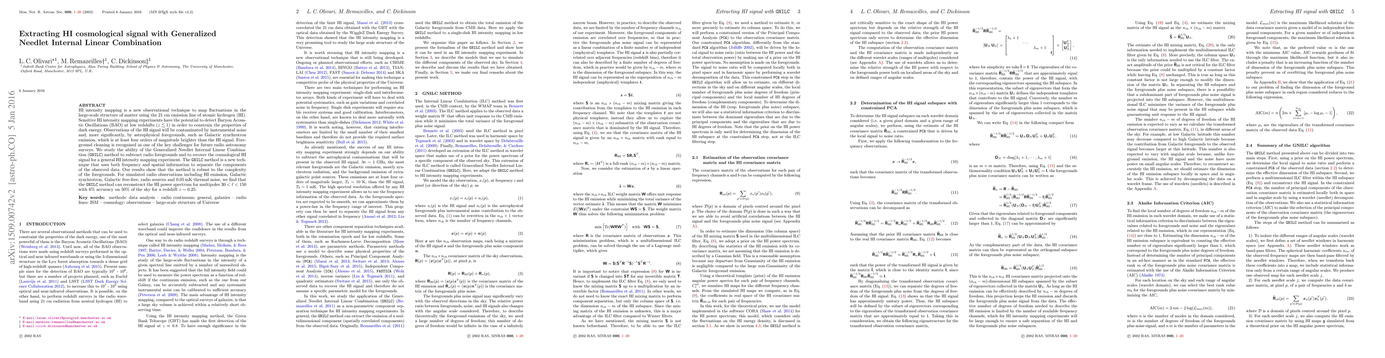 This paper explores the Generalized Needlet Internal Linear Combination (GNILC) method for extracting the HI cosmological signal from radio observations, addressing the challenge of foreground contamination. The GNILC method effectively separates HI signals from Galactic synchrotron and other foregrounds, achieving a 6% accuracy in reconstructing the HI power spectrum for multipoles 30 < l < 150 over 50% of the sky at redshift z ~ 0.25.