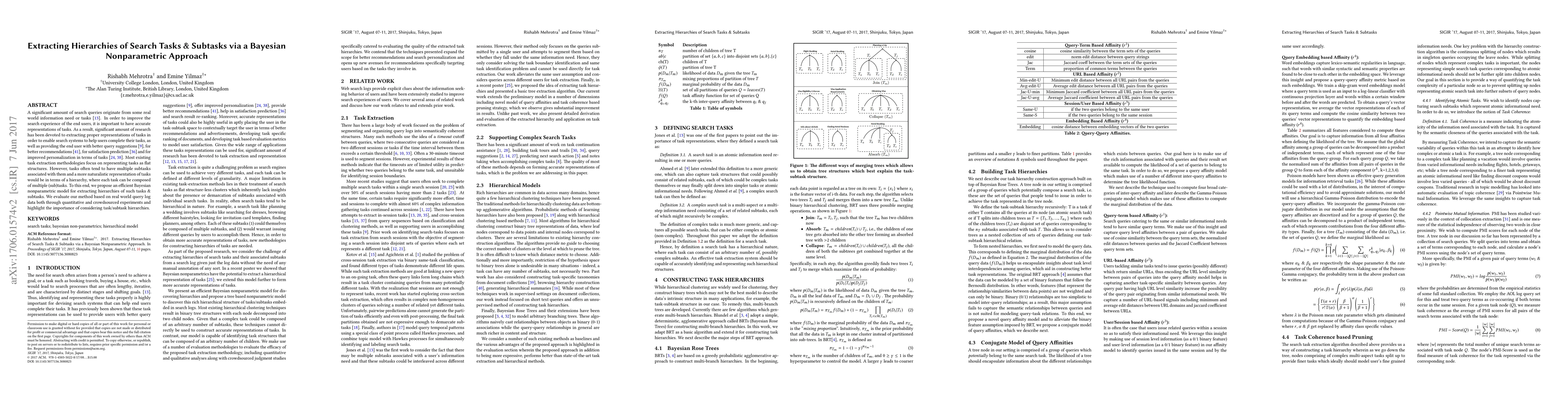 This paper proposes a Bayesian nonparametric model to extract hierarchical structures of search tasks and their subtasks, aiming to improve search experience and personalization. The method is evaluated using real-world query logs, demonstrating the benefits of hierarchical task representations over flat structures.