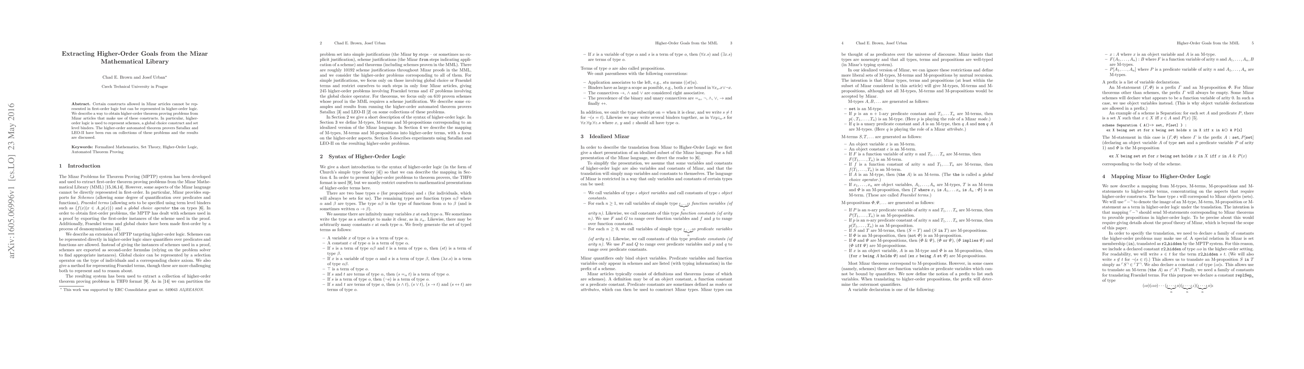 Certain constructs allowed in Mizar articles cannot be represented in first-order logic but can be represented in higher-order logic. We describe a way to obtain higher-order theorem proving problems from Mizar articles that make use of these constructs. In particular, higher-order logic is used to represent schemes, a global choice construct and set level binders. The higher-order automated theorem provers Satallax and LEO-II have been run on collections of these problems and the results are discussed.