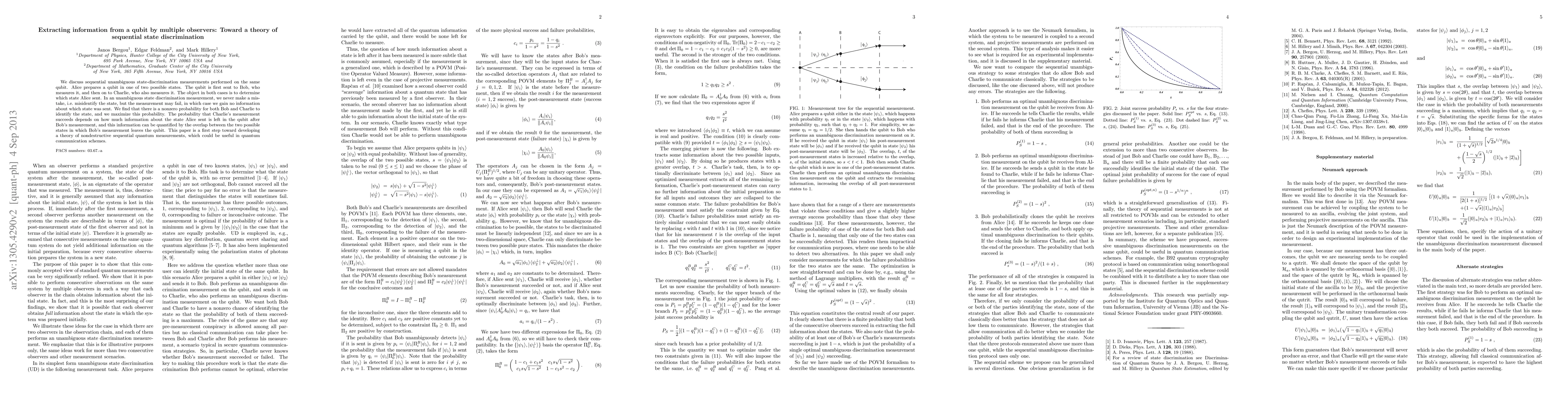 We discuss sequential unambiguous state-discrimination measurements performed on the same qubit. Alice prepares a qubit in one of two possible states. The qubit is first sent to Bob, who measures it, and then on to Charlie, who also measures it. The object in both cases is to determine which state Alice sent. In an unambiguous state discrimination measurement, we never make a mistake, i.e. misidentify the state, but the measurement may fail, in which case we gain no information about which state was sent. We find that there is a nonzero probability for both Bob and Charlie to identify the state, and we maximize this probability. The probability that Charlie's measurement succeeds depends on how much information about the state Alice sent is left in the qubit after Bob's measurement, and this information can be quantified by the overlap between the two possible states in which Bob's measurement leaves the qubit. This paper is a first step toward developing a theory of nondestructive sequential quantum measurements, which could be useful in quantum communication schemes.