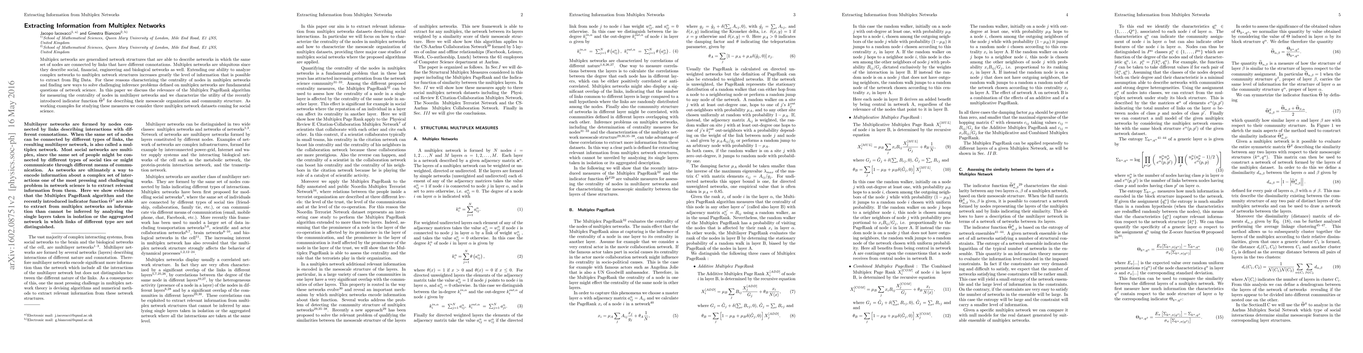 This paper explores the analysis of multiplex networks, introducing the Multiplex PageRank algorithm for node centrality and the indicator function $\widetilde{\Theta}^{S}$ for mesoscale organization and community structure. It applies these measures to three social science datasets to demonstrate their utility.