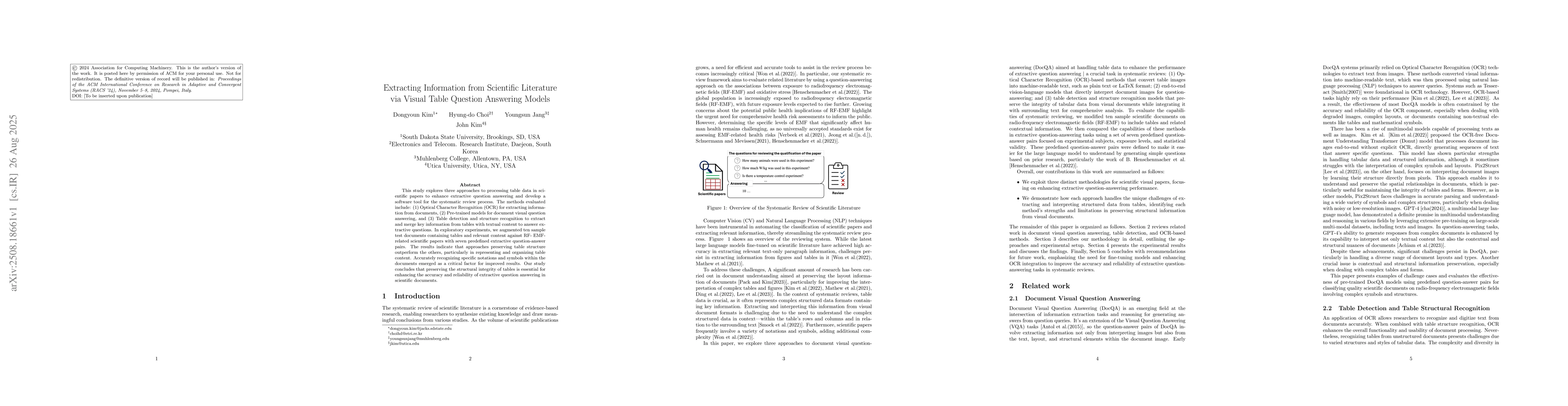 This study explores three approaches to processing table data in scientific papers to enhance extractive question answering and develop a software tool for the systematic review process. The methods evaluated include: (1) Optical Character Recognition (OCR) for extracting information from documents, (2) Pre-trained models for document visual question answering, and (3) Table detection and structure recognition to extract and merge key information from tables with textual content to answer extractive questions. In exploratory experiments, we augmented ten sample test documents containing tables and relevant content against RF- EMF-related scientific papers with seven predefined extractive question-answer pairs. The results indicate that approaches preserving table structure outperform the others, particularly in representing and organizing table content. Accurately recognizing specific notations and symbols within the documents emerged as a critical factor for improved results. Our study concludes that preserving the structural integrity of tables is essential for enhancing the accuracy and reliability of extractive question answering in scientific documents.