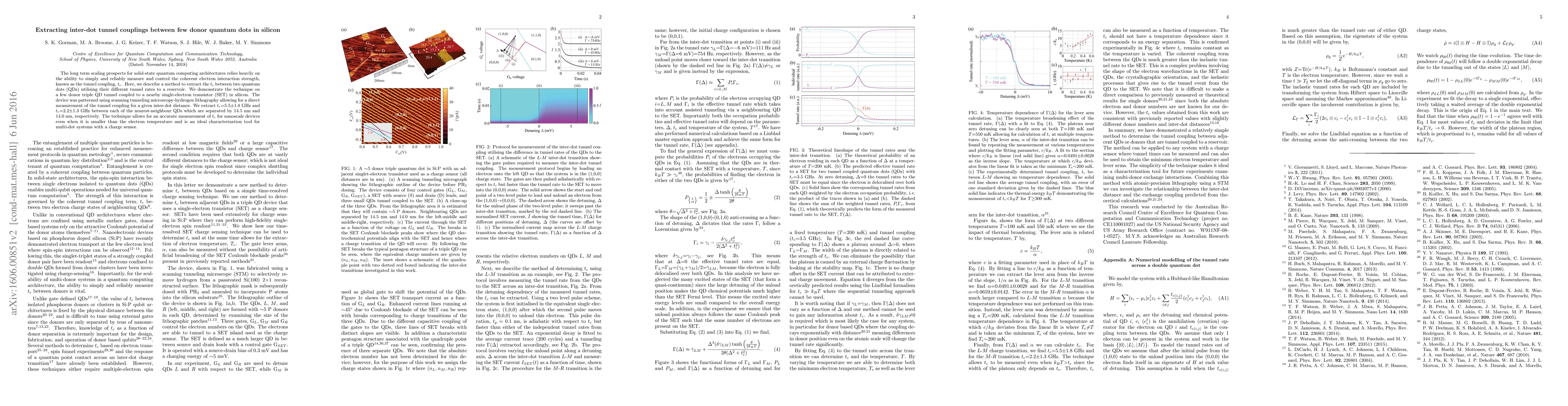 The long term scaling prospects for solid-state quantum computing architectures relies heavily on the ability to simply and reliably measure and control the coherent electron interaction strength, known as the tunnel coupling, $t_c$. Here, we describe a method to extract the $t_c$ between two quantum dots (QDs) utilising their different tunnel rates to a reservoir. We demonstrate the technique on a few donor triple QD tunnel coupled to a nearby single-electron transistor (SET) in silicon. The device was patterned using scanning tunneling microscopy-hydrogen lithography allowing for a direct measurement of the tunnel coupling for a given inter-dot distance. We extract ${t}_{{\rm{c}}}=5.5\pm 1.8\;{\rm{GHz}}$ and ${t}_{{\rm{c}}}=2.2\pm 1.3\;{\rm{GHz}}$ between each of the nearest-neighbour QDs which are separated by 14.5 nm and 14.0 nm, respectively. The technique allows for an accurate measurement of $t_c$ for nanoscale devices even when it is smaller than the electron temperature and is an ideal characterisation tool for multi-dot systems with a charge sensor.