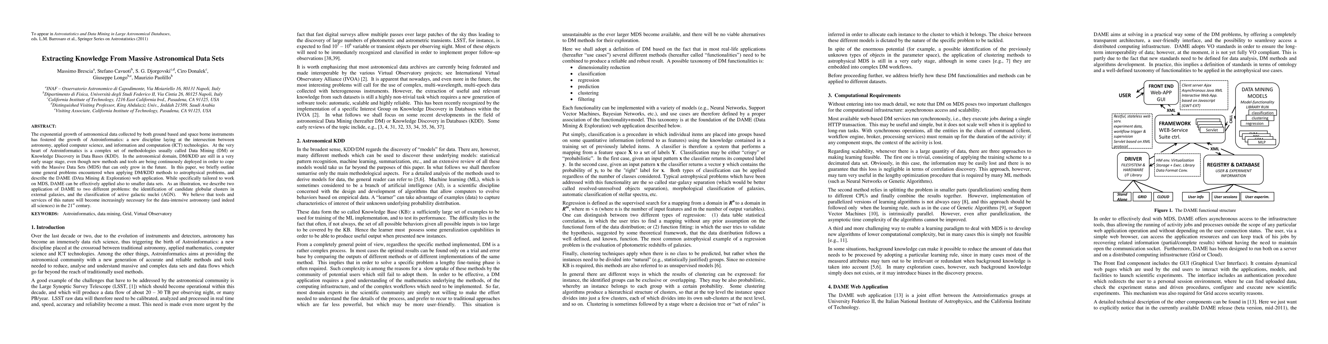This paper discusses the challenges of applying data mining and knowledge discovery methods to massive astronomical datasets, introducing the DAME web application designed to tackle these issues. It showcases DAME's effectiveness in identifying globular clusters and classifying active galactic nuclei, emphasizing its potential importance for data-intensive astronomy.