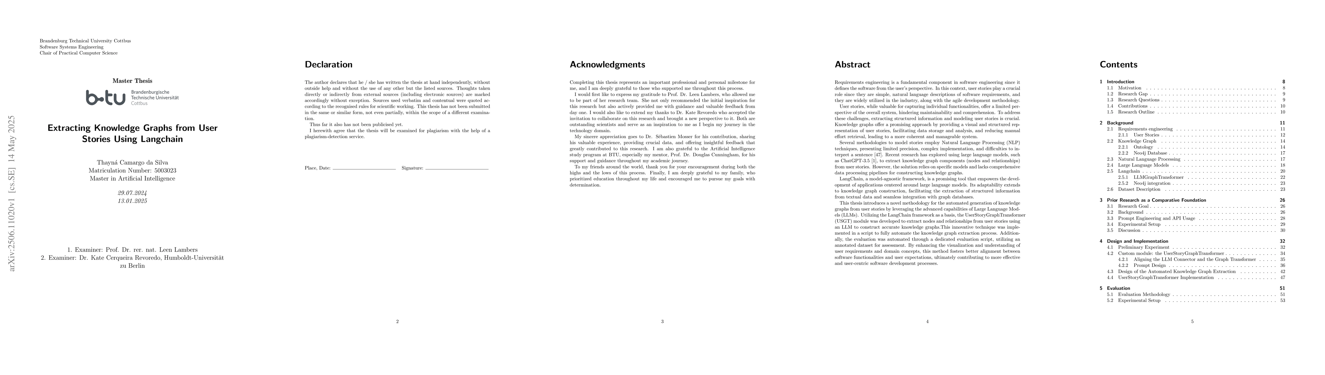 This thesis introduces a novel methodology for the automated generation of knowledge graphs from user stories by leveraging the advanced capabilities of Large Language Models. Utilizing the LangChain framework as a basis, the User Story Graph Transformer module was developed to extract nodes and relationships from user stories using an LLM to construct accurate knowledge graphs.This innovative technique was implemented in a script to fully automate the knowledge graph extraction process. Additionally, the evaluation was automated through a dedicated evaluation script, utilizing an annotated dataset for assessment. By enhancing the visualization and understanding of user requirements and domain concepts, this method fosters better alignment between software functionalities and user expectations, ultimately contributing to more effective and user-centric software development processes.