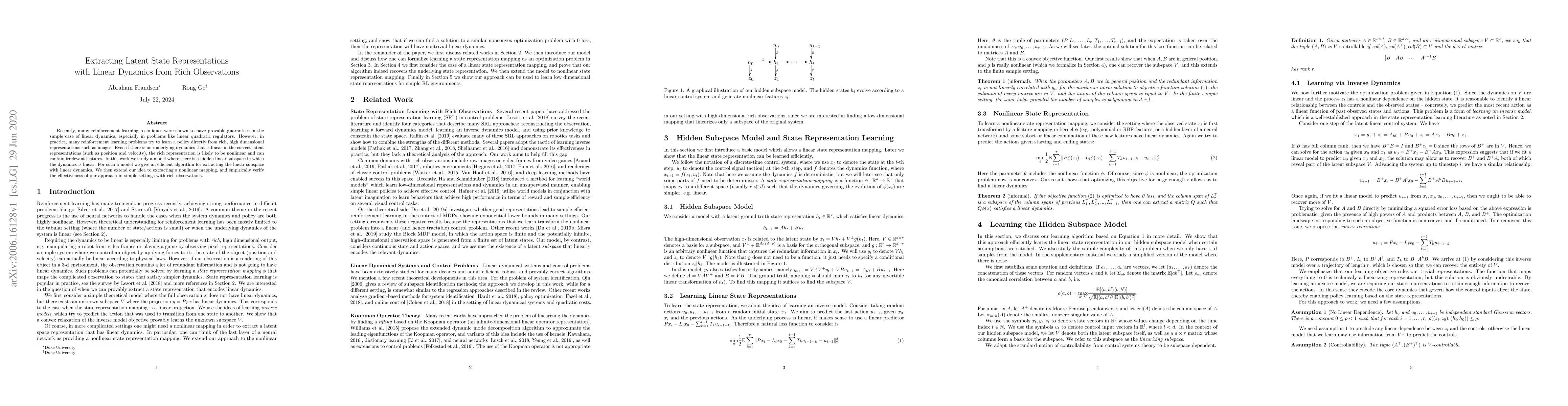 Recently, many reinforcement learning techniques were shown to have provable guarantees in the simple case of linear dynamics, especially in problems like linear quadratic regulators. However, in practice, many reinforcement learning problems try to learn a policy directly from rich, high dimensional representations such as images. Even if there is an underlying dynamics that is linear in the correct latent representations (such as position and velocity), the rich representation is likely to be nonlinear and can contain irrelevant features. In this work we study a model where there is a hidden linear subspace in which the dynamics is linear. For such a model we give an efficient algorithm for extracting the linear subspace with linear dynamics. We then extend our idea to extracting a nonlinear mapping, and empirically verify the effectiveness of our approach in simple settings with rich observations.