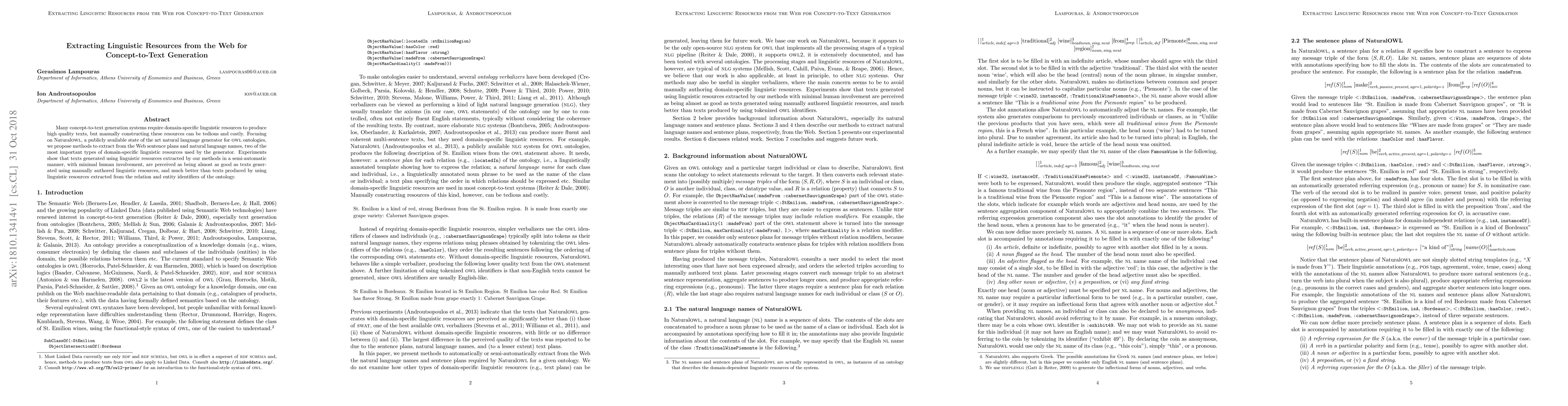 Many concept-to-text generation systems require domain-specific linguistic resources to produce high quality texts, but manually constructing these resources can be tedious and costly. Focusing on NaturalOWL, a publicly available state of the art natural language generator for OWL ontologies, we propose methods to extract from the Web sentence plans and natural language names, two of the most important types of domain-specific linguistic resources used by the generator. Experiments show that texts generated using linguistic resources extracted by our methods in a semi-automatic manner, with minimal human involvement, are perceived as being almost as good as texts generated using manually authored linguistic resources, and much better than texts produced by using linguistic resources extracted from the relation and entity identifiers of the ontology.