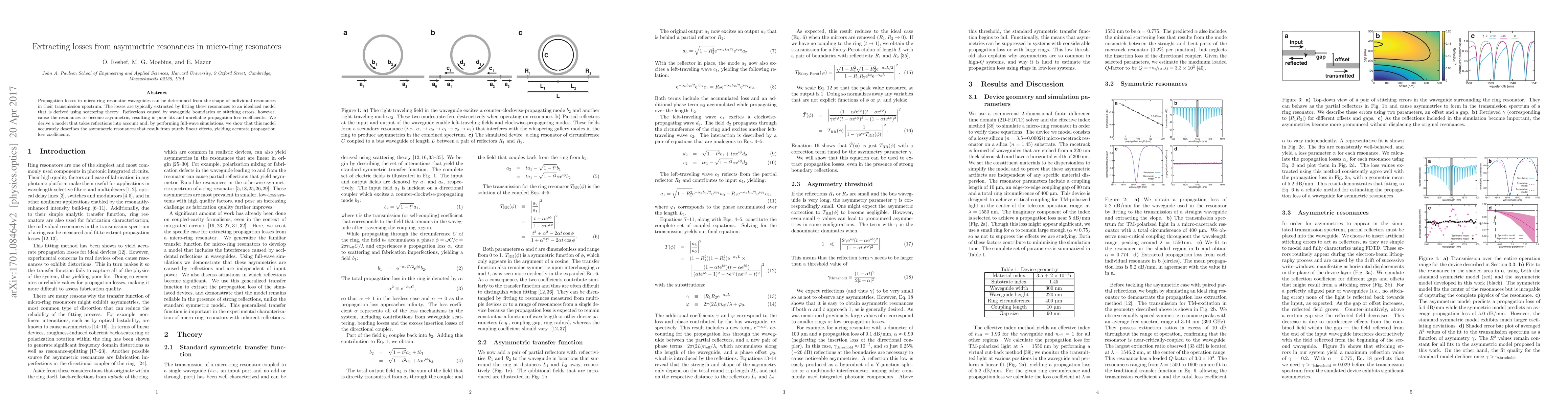 Propagation losses in micro-ring resonator waveguides can be determined from the shape of individual resonances in their transmission spectrum. The losses are typically extracted by fitting these resonances to an idealized model that is derived using scattering theory. Reflections caused by waveguide boundaries or stitching errors, however, cause the resonances to become asymmetric, resulting in poor fits and unreliable propagation loss coefficients. We derive a model that takes reflections into account and, by performing full-wave simulations, we show that this model accurately describes the asymmetric resonances that result from purely linear effects, yielding accurate propagation loss coefficients.