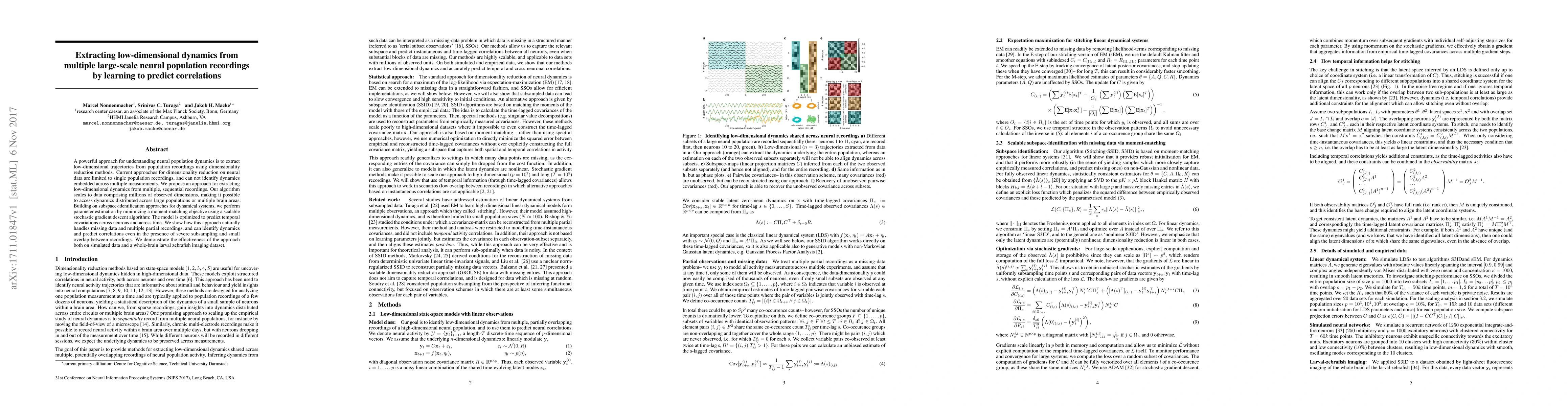 This paper proposes an advanced algorithm for extracting low-dimensional neural population dynamics from multiple large-scale recordings by predicting temporal correlations across neurons and time. It scales to handle millions of dimensions and can identify and predict dynamics across various brain areas, even with missing data and partial recordings.