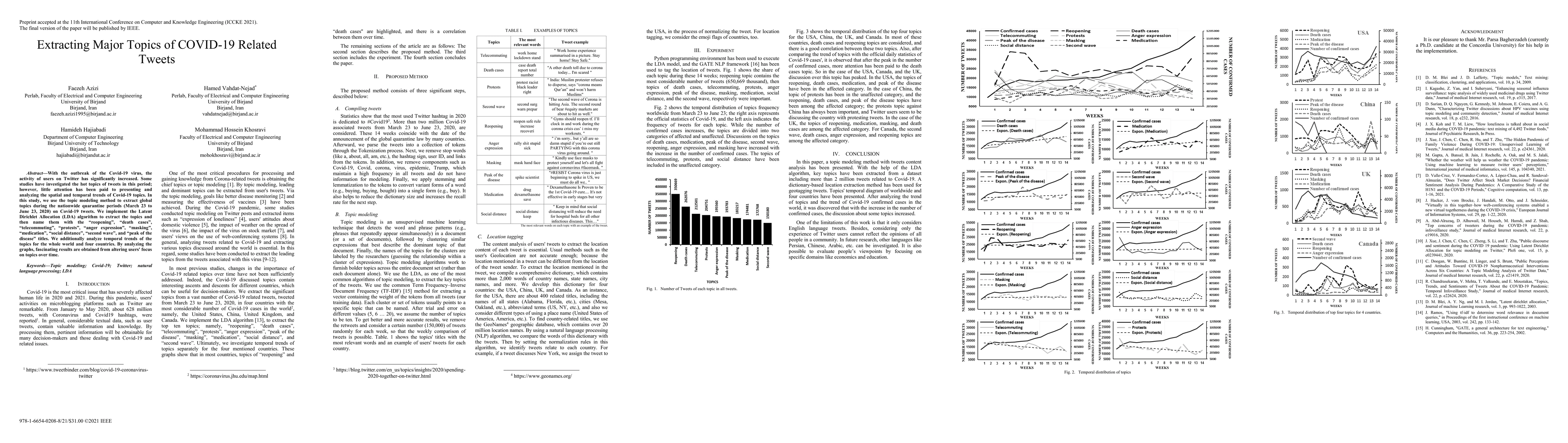 This study uses LDA to extract major global COVID-19 topics from tweets during quarantine periods, identifying topics like "reopening" and "death cases," and analyzes their temporal trends worldwide and in four selected countries. Results reveal shifting user focus on these topics over time.