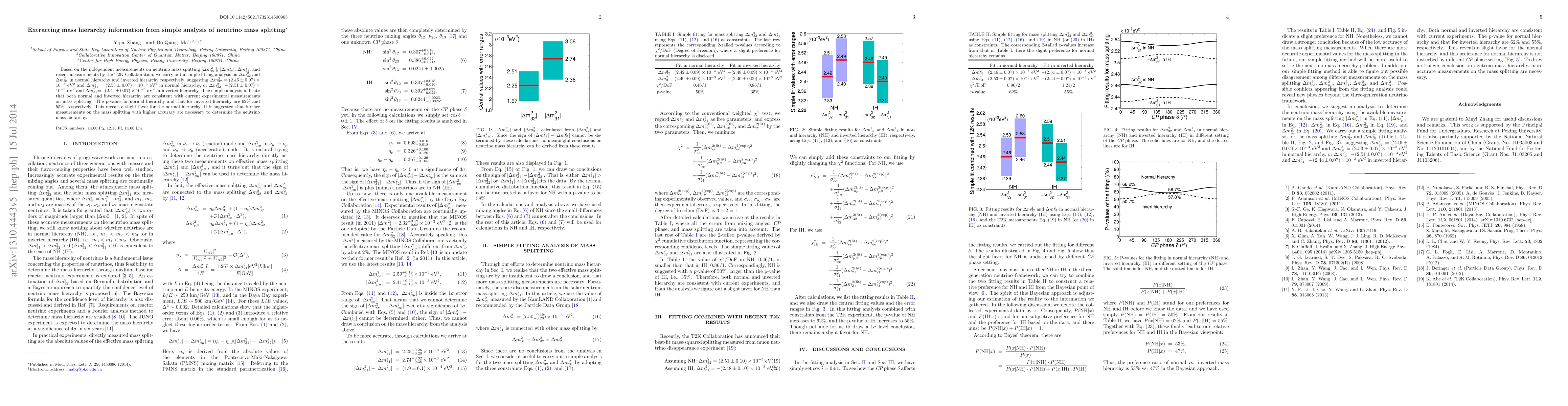 Based on the independent measurements on neutrino mass splitting $|\Delta m^2_{\mu\mu}|$, $|\Delta m^2_{ee}|$, $\Delta m^2_{21}$, and recent measurements by the T2K Collaboration, we carry out a simple fitting analysis on $\Delta m^2_{32}$ and $\Delta m^2_{31}$ in normal hierarchy and inverse hierarchy respectively, suggesting $\Delta m^2_{32}=(2.46\pm0.07)\times10^{-3}~\mbox{eV}^2$ and $\Delta m^2_{31}=(2.53\pm0.07)\times10^{-3}~\mbox{eV}^2$ in normal hierarchy, or $\Delta m^2_{32}$=$-(2.51\pm0.07)\times10^{-3}~\mbox{eV}^2$ and $\Delta m^2_{31}$=$-(2.44\pm0.07)\times10^{-3}~\mbox{eV}^2$ in invert hierarchy. The simple analysis indicate that both normal and inverted hierarchy are consistent with current experimental measurements on mass splitting. The p-value for normal hierarchy and that for inverted hierarchy are 62% and 55%, respectively. This reveals a slight favor for the normal hierarchy. It is suggested that further measurements on the mass splitting with higher accuracy are necessary to determine the neutrino mass hierarchy.