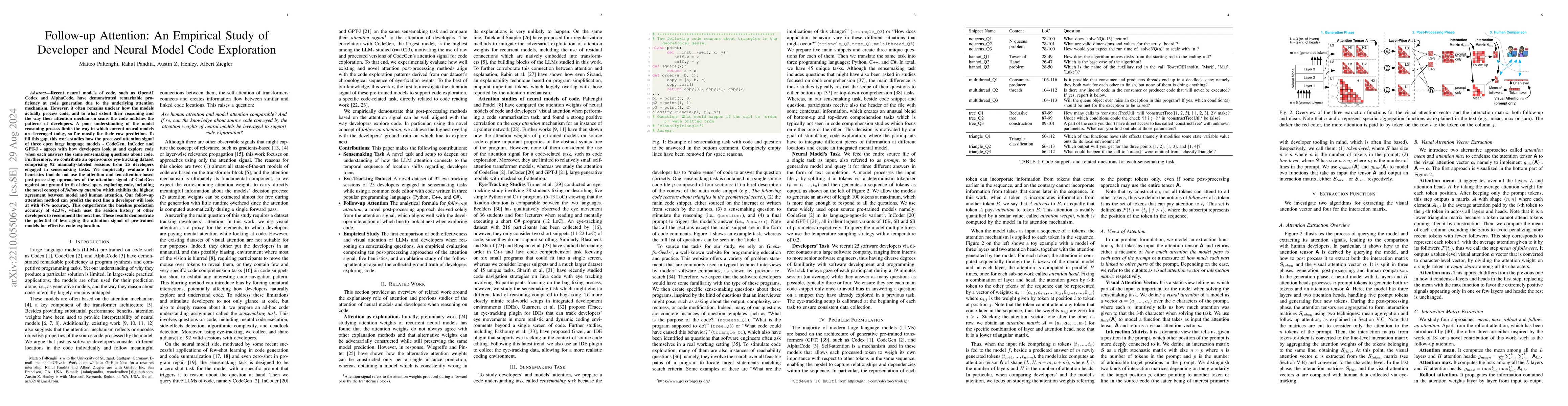 The high effectiveness of neural models of code, such as OpenAI Codex and AlphaCode, suggests coding capabilities of models that are at least comparable to those of humans. However, previous work has only used these models for their raw completion, ignoring how the model reasoning, in the form of attention weights, can be used for other downstream tasks. Disregarding the attention weights means discarding a considerable portion of what those models compute when queried. To profit more from the knowledge embedded in these large pre-trained models, this work compares multiple approaches to post-process these valuable attention weights for supporting code exploration. Specifically, we compare to which extent the transformed attention signal of CodeGen, a large and publicly available pretrained neural model, agrees with how developers look at and explore code when each answering the same sense-making questions about code. At the core of our experimental evaluation, we collect, manually annotate, and open-source a novel eye-tracking dataset comprising 25 developers answering sense-making questions on code over 92 sessions. We empirically evaluate five attention-agnostic heuristics and ten attention-based post processing approaches of the attention signal against our ground truth of developers exploring code, including the novel concept of follow-up attention which exhibits the highest agreement. Beyond the dataset contribution and the empirical study, we also introduce a novel practical application of the attention signal of pre-trained models with completely analytical solutions, going beyond how neural models' attention mechanisms have traditionally been used.
