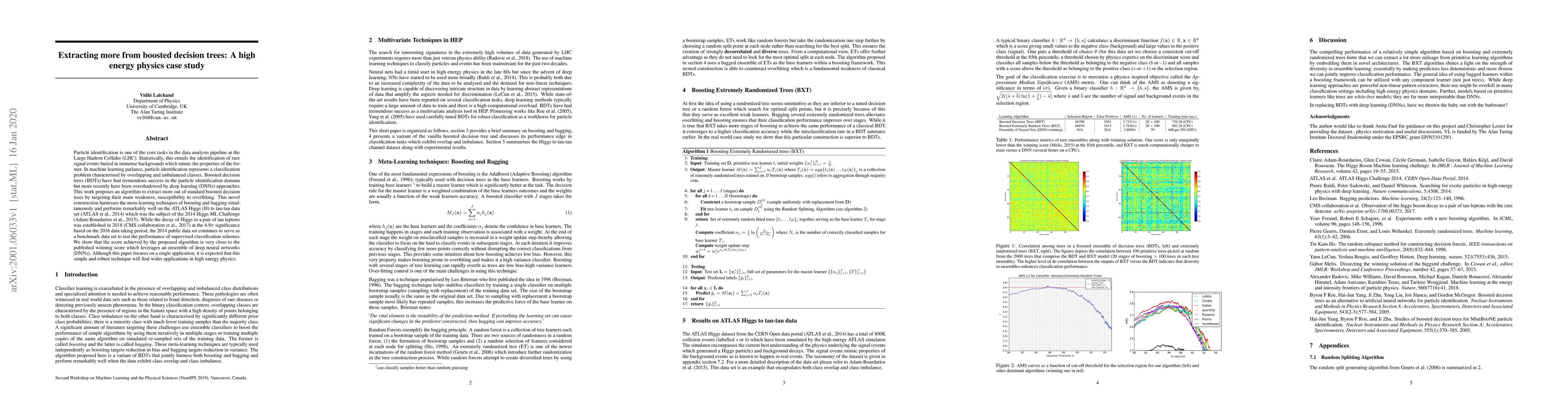 Particle identification is one of the core tasks in the data analysis pipeline at the Large Hadron Collider (LHC). Statistically, this entails the identification of rare signal events buried in immense backgrounds that mimic the properties of the former. In machine learning parlance, particle identification represents a classification problem characterized by overlapping and imbalanced classes. Boosted decision trees (BDTs) have had tremendous success in the particle identification domain but more recently have been overshadowed by deep learning (DNNs) approaches. This work proposes an algorithm to extract more out of standard boosted decision trees by targeting their main weakness, susceptibility to overfitting. This novel construction harnesses the meta-learning techniques of boosting and bagging simultaneously and performs remarkably well on the ATLAS Higgs (H) to tau-tau data set (ATLAS et al., 2014) which was the subject of the 2014 Higgs ML Challenge (Adam-Bourdarios et al., 2015). While the decay of Higgs to a pair of tau leptons was established in 2018 (CMS collaboration et al., 2017) at the 4.9$\sigma$ significance based on the 2016 data taking period, the 2014 public data set continues to serve as a benchmark data set to test the performance of supervised classification schemes. We show that the score achieved by the proposed algorithm is very close to the published winning score which leverages an ensemble of deep neural networks (DNNs). Although this paper focuses on a single application, it is expected that this simple and robust technique will find wider applications in high energy physics.