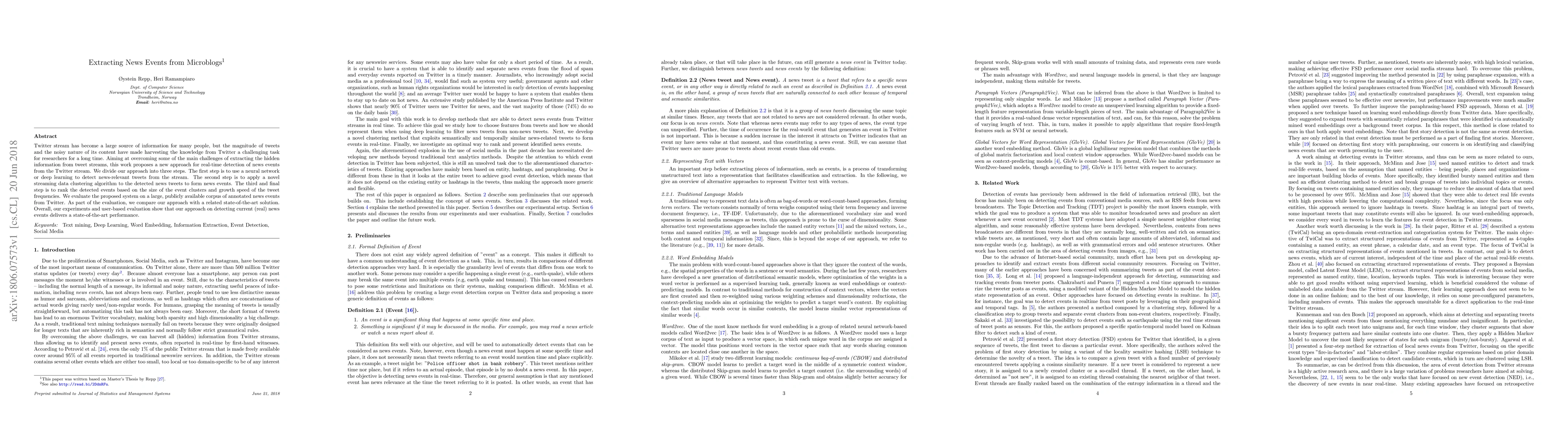 This paper proposes a new method for real-time detection of news events from Twitter streams using neural networks, a streaming data clustering algorithm, and ranking based on cluster size and growth speed. The method outperforms existing solutions, as demonstrated by experiments and user evaluations.