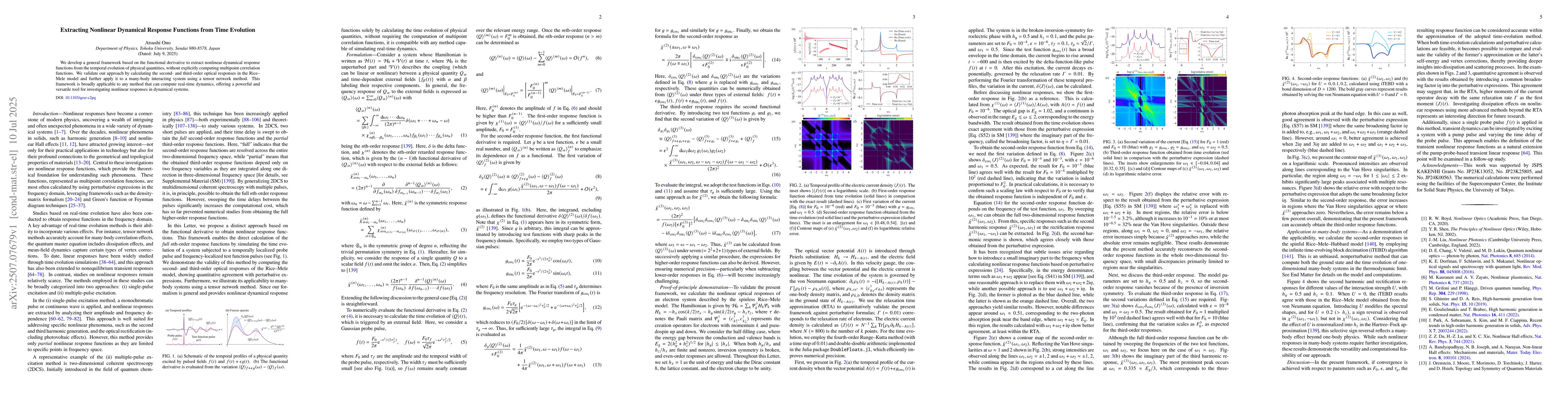 The research develops a framework based on functional derivatives to extract nonlinear dynamical response functions from temporal evolution without computing multipoint correlation functions. It validates this approach using the Rice-Mele model and applies it to an interacting many-body system via tensor networks.