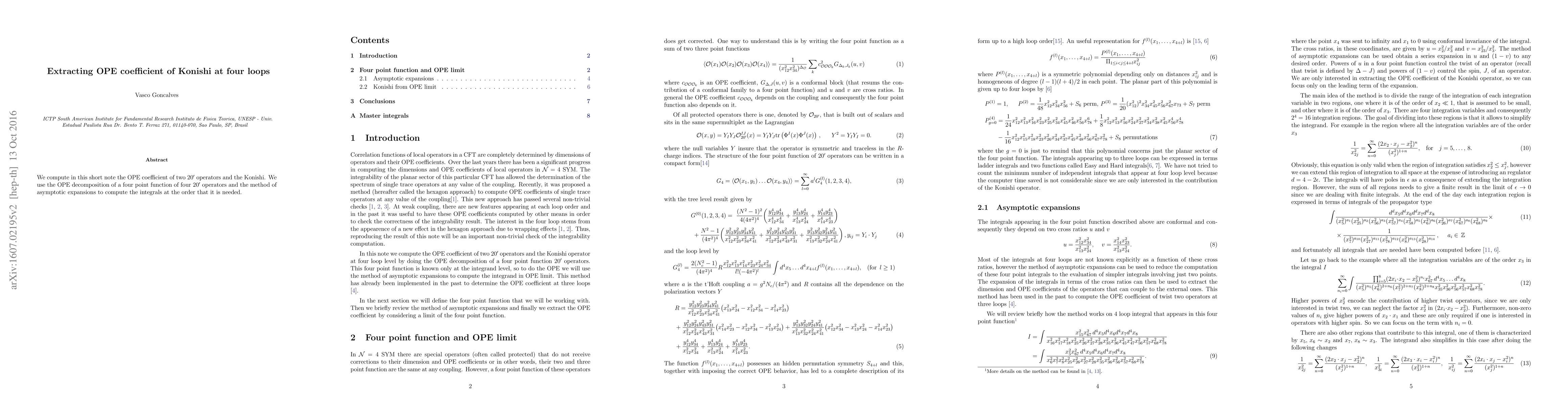 This paper calculates the OPE coefficient for the Konishi operator at four loops using the OPE decomposition of a four-point function of four 20' operators and the method of asymptotic expansions to evaluate the necessary integrals. The result provides a detailed contribution to the understanding of higher-loop corrections in supersymmetric gauge theories.