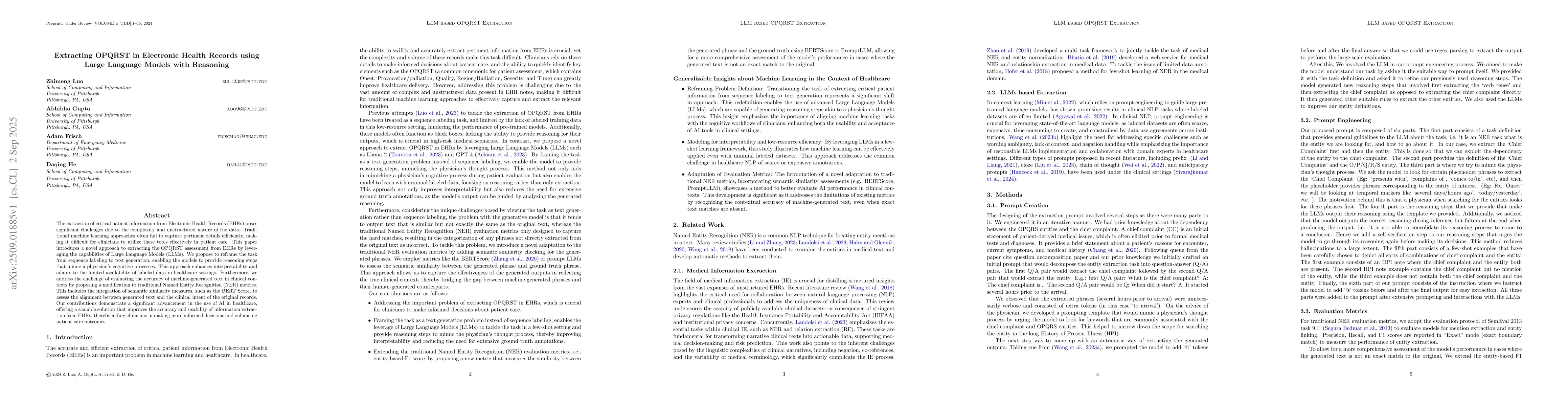 The extraction of critical patient information from Electronic Health Records (EHRs) poses significant challenges due to the complexity and unstructured nature of the data. Traditional machine learning approaches often fail to capture pertinent details efficiently, making it difficult for clinicians to utilize these tools effectively in patient care. This paper introduces a novel approach to extracting the OPQRST assessment from EHRs by leveraging the capabilities of Large Language Models (LLMs). We propose to reframe the task from sequence labeling to text generation, enabling the models to provide reasoning steps that mimic a physician's cognitive processes. This approach enhances interpretability and adapts to the limited availability of labeled data in healthcare settings. Furthermore, we address the challenge of evaluating the accuracy of machine-generated text in clinical contexts by proposing a modification to traditional Named Entity Recognition (NER) metrics. This includes the integration of semantic similarity measures, such as the BERT Score, to assess the alignment between generated text and the clinical intent of the original records. Our contributions demonstrate a significant advancement in the use of AI in healthcare, offering a scalable solution that improves the accuracy and usability of information extraction from EHRs, thereby aiding clinicians in making more informed decisions and enhancing patient care outcomes.
