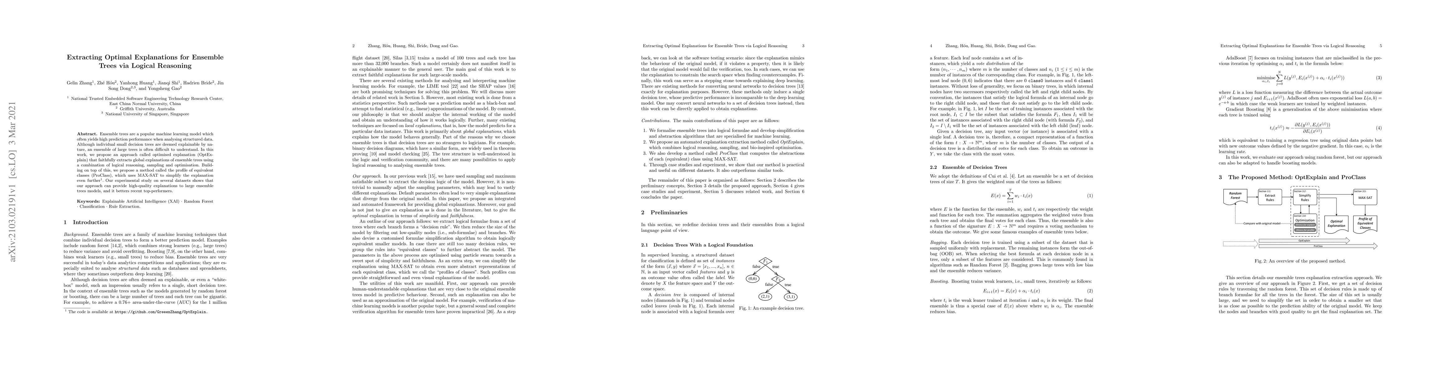 This paper proposes OptExplain, an approach for extracting optimal global explanations from ensemble trees using logical reasoning, sampling, and optimization. It further introduces ProClass, which leverages MAX-SAT to simplify these explanations. Experimental results demonstrate that the method provides high-quality explanations that outperform recent state-of-the-art techniques.