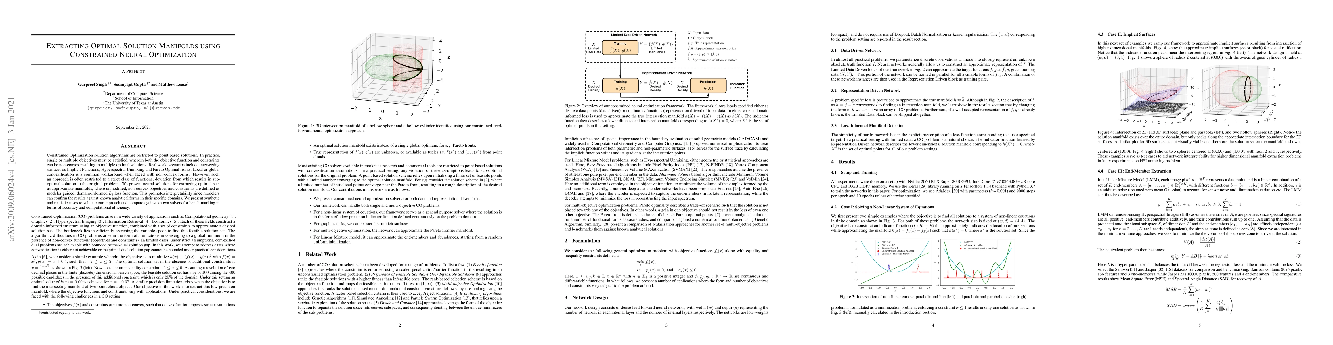 Constrained Optimization solution algorithms are restricted to point based solutions. In practice, single or multiple objectives must be satisfied, wherein both the objective function and constraints can be non-convex resulting in multiple optimal solutions. Real world scenarios include intersecting surfaces as Implicit Functions, Hyperspectral Unmixing and Pareto Optimal fronts. Local or global convexification is a common workaround when faced with non-convex forms. However, such an approach is often restricted to a strict class of functions, deviation from which results in sub-optimal solution to the original problem. We present neural solutions for extracting optimal sets as approximate manifolds, where unmodified, non-convex objectives and constraints are defined as modeler guided, domain-informed $L_2$ loss function. This promotes interpretability since modelers can confirm the results against known analytical forms in their specific domains. We present synthetic and realistic cases to validate our approach and compare against known solvers for bench-marking in terms of accuracy and computational efficiency.