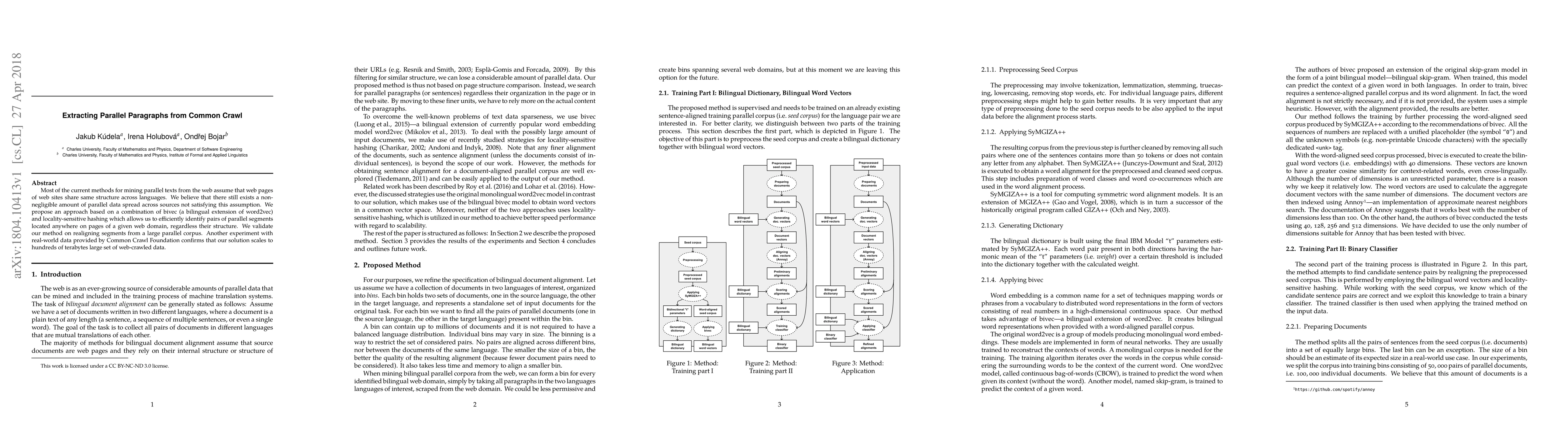 This paper proposes a method to identify parallel text segments across different languages in web pages that do not share the same structure, using bivec and locality-sensitive hashing. The approach is validated on a large parallel corpus and shown to scale to large datasets from Common Crawl.