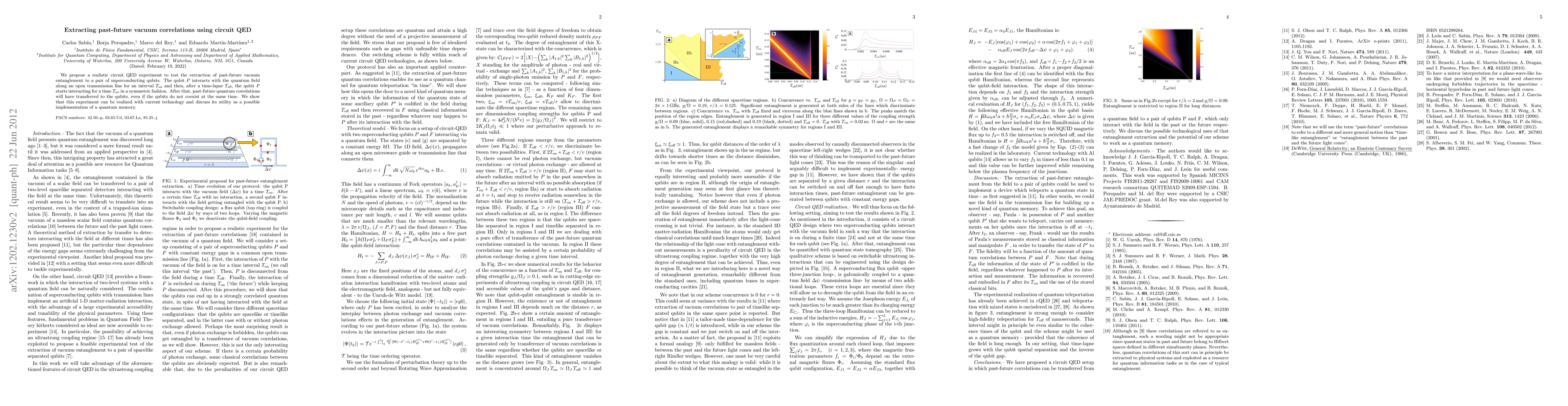 We propose a realistic circuit QED experiment to test the extraction of past-future vacuum entanglement to a pair of superconducting qubits. The qubit P interacts with the quantum field along an open transmission line for an interval T_on and then, after a time-lapse T_off, the qubit F starts interacting for a time T_on in a symmetric fashion. After that, past-future quantum correlations will have transferred to the qubits, even if the qubits do not coexist at the same time. We show that this experiment can be realized with current technology and discuss its utility as a possible implementation of a quantum memory.