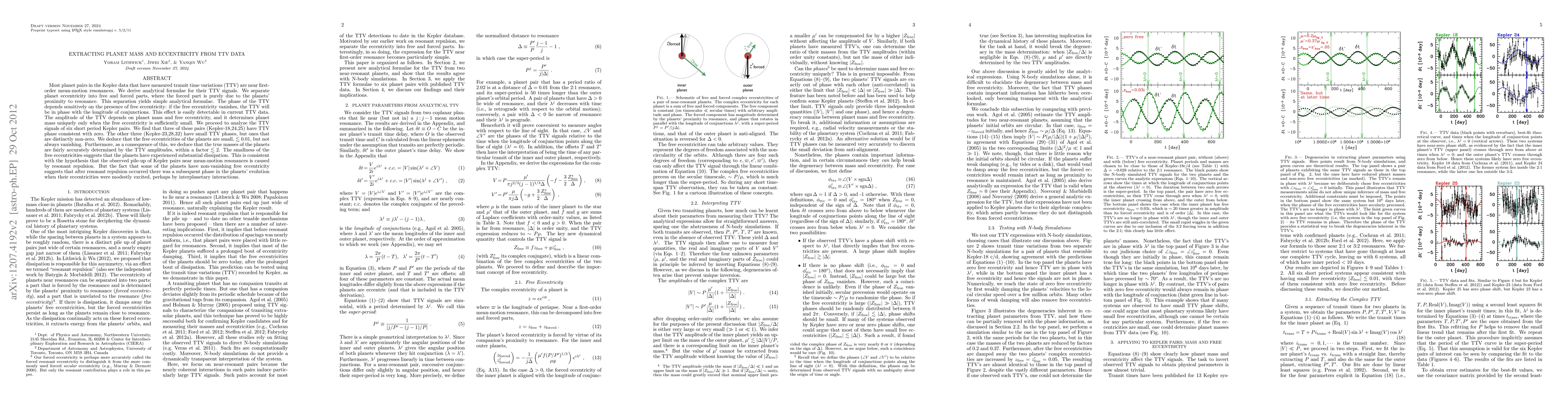 Most planet pairs in the Kepler data that have measured transit time variations (TTV) are near first-order mean-motion resonances. We derive analytical formulae for their TTV signals. We separate planet eccentricity into free and forced parts, where the forced part is purely due to the planets' proximity to resonance. This separation yields simple analytical formulae. The phase of the TTV depends sensitively on the presence of free eccentricity: if the free eccentricity vanishes, the TTV will be in phase with the longitude of conjunctions. This effect is easily detectable in current TTV data. The amplitude of the TTV depends on planet mass and free eccentricity, and it determines planet mass uniquely only when the free eccentricity is sufficiently small. We proceed to analyze the TTV signals of six short period Kepler pairs. We find that three of these pairs (Kepler-18,24,25) have TTV phase consistent with zero. The other three (Kepler-23,28,32) have small TTV phases, but ones that are distinctly non-zero. We deduce that the free eccentricities of the planets are small, < 0.01, but not always vanishing. Furthermore, as a consequence of this, we deduce that the true masses of the planets are fairly accurately determined by the TTV amplitudes, within a factor < 2. The smallness of the free eccentricities suggests that the planets have experienced substantial dissipation. This is consistent with the hypothesis that the observed pile-up of Kepler pairs near mean-motion resonances is caused by resonant repulsion. But the fact that some of the planets have non-vanishing free eccentricity suggests that after resonant repulsion occurred there was a subsequent phase in the planets' evolution when their eccentricities were modestly excited, perhaps by interplanetary interactions.