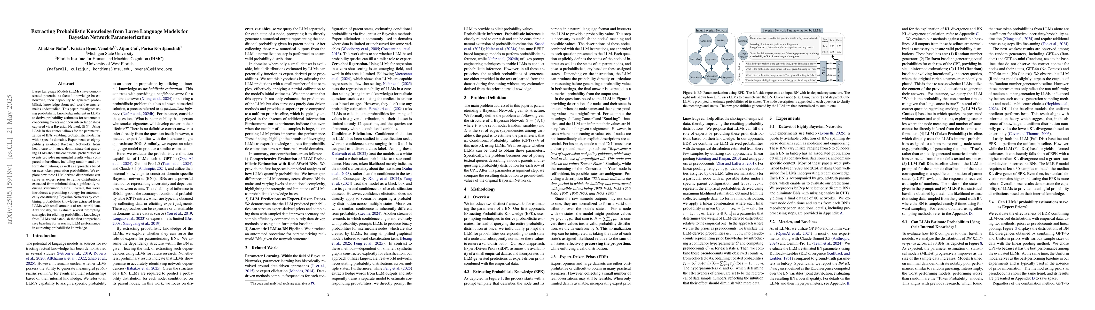 Researchers successfully used large language models to extract probabilistic knowledge about real-world events for Bayesian network parameterization, outperforming baselines in healthcare and finance domains.