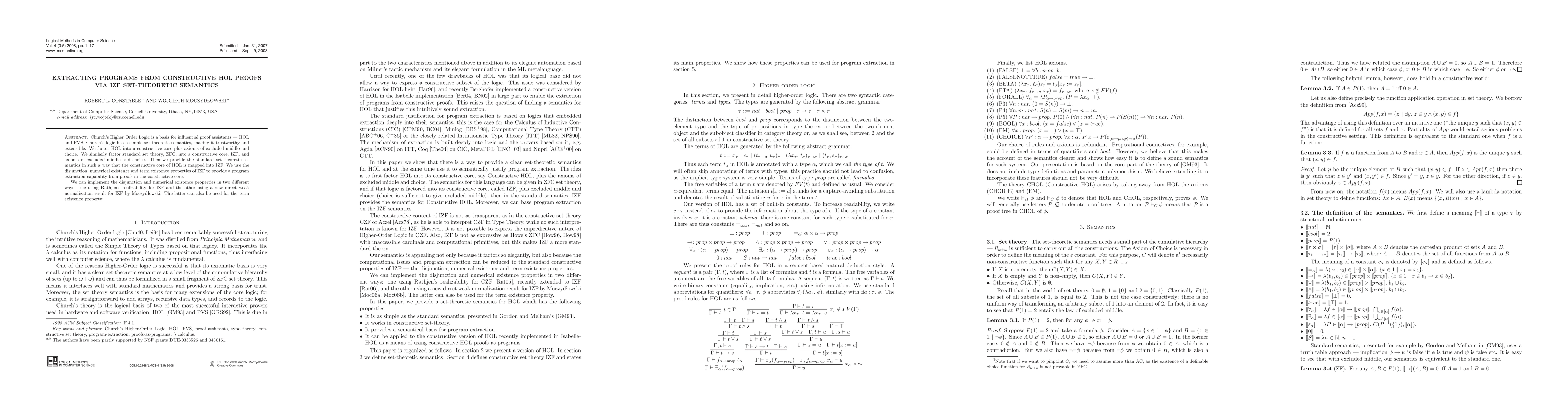 Church's Higher Order Logic is a basis for influential proof assistants -- HOL and PVS. Church's logic has a simple set-theoretic semantics, making it trustworthy and extensible. We factor HOL into a constructive core plus axioms of excluded middle and choice. We similarly factor standard set theory, ZFC, into a constructive core, IZF, and axioms of excluded middle and choice. Then we provide the standard set-theoretic semantics in such a way that the constructive core of HOL is mapped into IZF. We use the disjunction, numerical existence and term existence properties of IZF to provide a program extraction capability from proofs in the constructive core. We can implement the disjunction and numerical existence properties in two different ways: one using Rathjen's realizability for IZF and the other using a new direct weak normalization result for IZF by Moczydlowski. The latter can also be used for the term existence property.