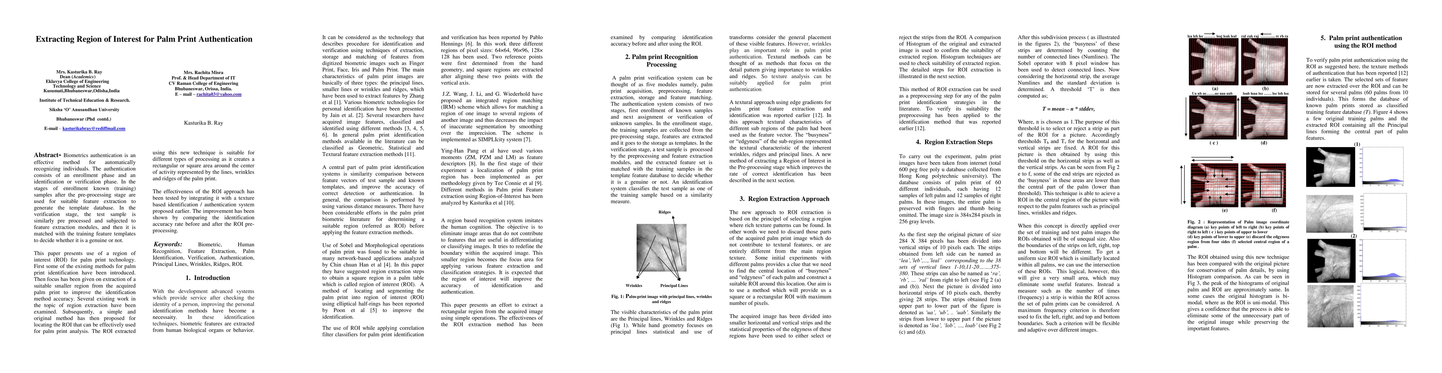 This paper introduces a novel method for extracting a region of interest (ROI) from palm prints to enhance authentication accuracy. The proposed technique identifies a central active area based on lines, wrinkles, and ridges, improving the identification process compared to traditional methods.