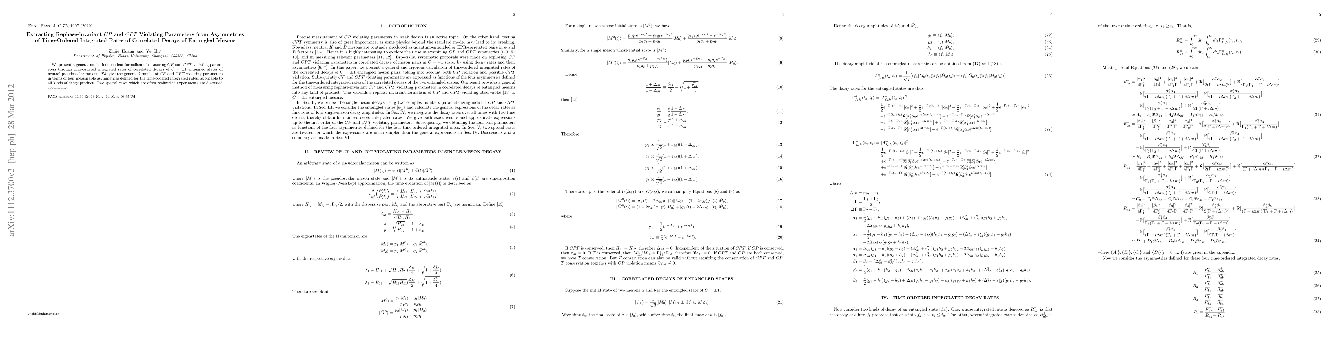 This paper introduces a model-independent method to measure CP and CPT violating parameters using time-ordered integrated rates of correlated decays of entangled neutral pseudoscalar mesons. It provides general formulae for these parameters in terms of four measurable asymmetries, applicable to various decay products.