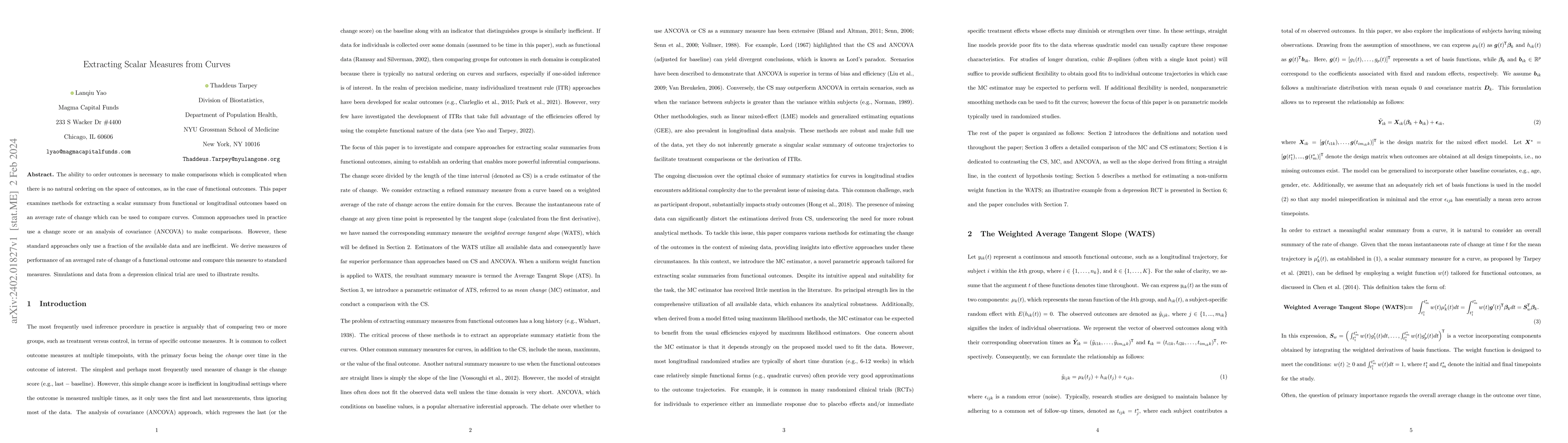 This paper proposes a method to extract a scalar measure from functional outcomes based on an averaged rate of change, aiming to better compare curves than traditional change scores or ANCOVA. Simulations and clinical trial data demonstrate the effectiveness of this new measure.