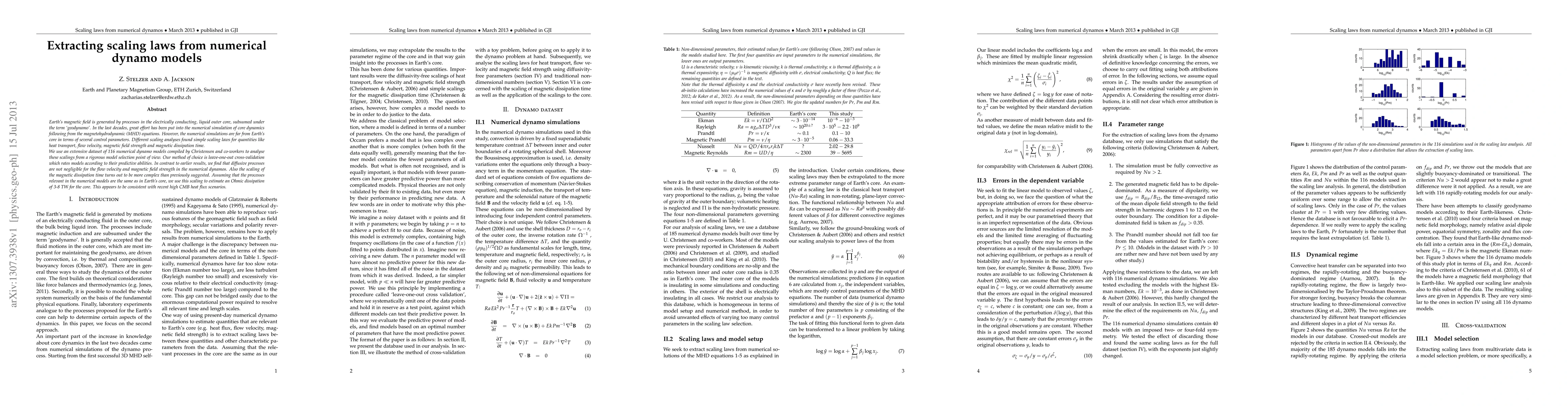 Earth's magnetic field is generated by processes in the electrically conducting, liquid outer core, subsumed under the term `geodynamo'. In the last decades, great effort has been put into the numerical simulation of core dynamics following from the magnetohydrodynamic (MHD) equations. However, the numerical simulations are far from Earth's core in terms of several control parameters. Different scaling analyses found simple scaling laws for quantities like heat transport, flow velocity, magnetic field strength and magnetic dissipation time. We use an extensive dataset of 116 numerical dynamo models compiled by Christensen and co-workers to analyse these scalings from a rigorous model selection point of view. Our method of choice is leave-one-out cross-validation which rates models according to their predictive abilities. In contrast to earlier results, we find that diffusive processes are not negligible for the flow velocity and magnetic field strength in the numerical dynamos. Also the scaling of the magnetic dissipation time turns out to be more complex than previously suggested. Assuming that the processes relevant in the numerical models are the same as in Earth's core, we use this scaling to estimate an Ohmic dissipation of 3-8 TW for the core. This appears to be consistent with recent high CMB heat flux scenarios.