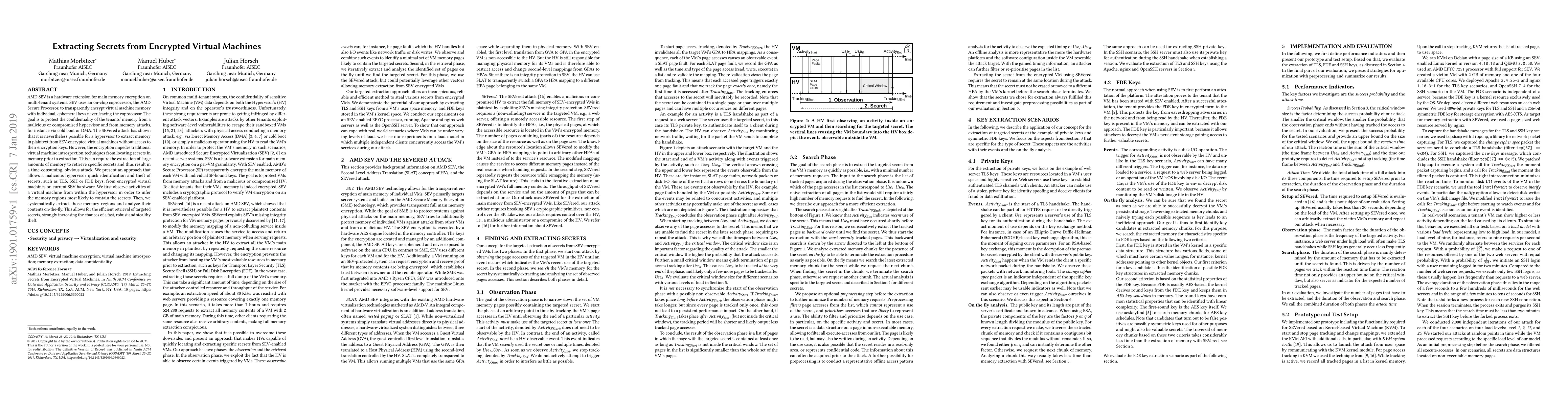 This paper presents a method for a malicious hypervisor to efficiently extract secrets like TLS, SSH, or FDE keys from encrypted virtual machines using AMD SEV, despite the encryption. It involves observing VM activities to identify likely secret-containing memory regions and then extracting and analyzing these regions on-the-fly for stealthy and effective secret theft.